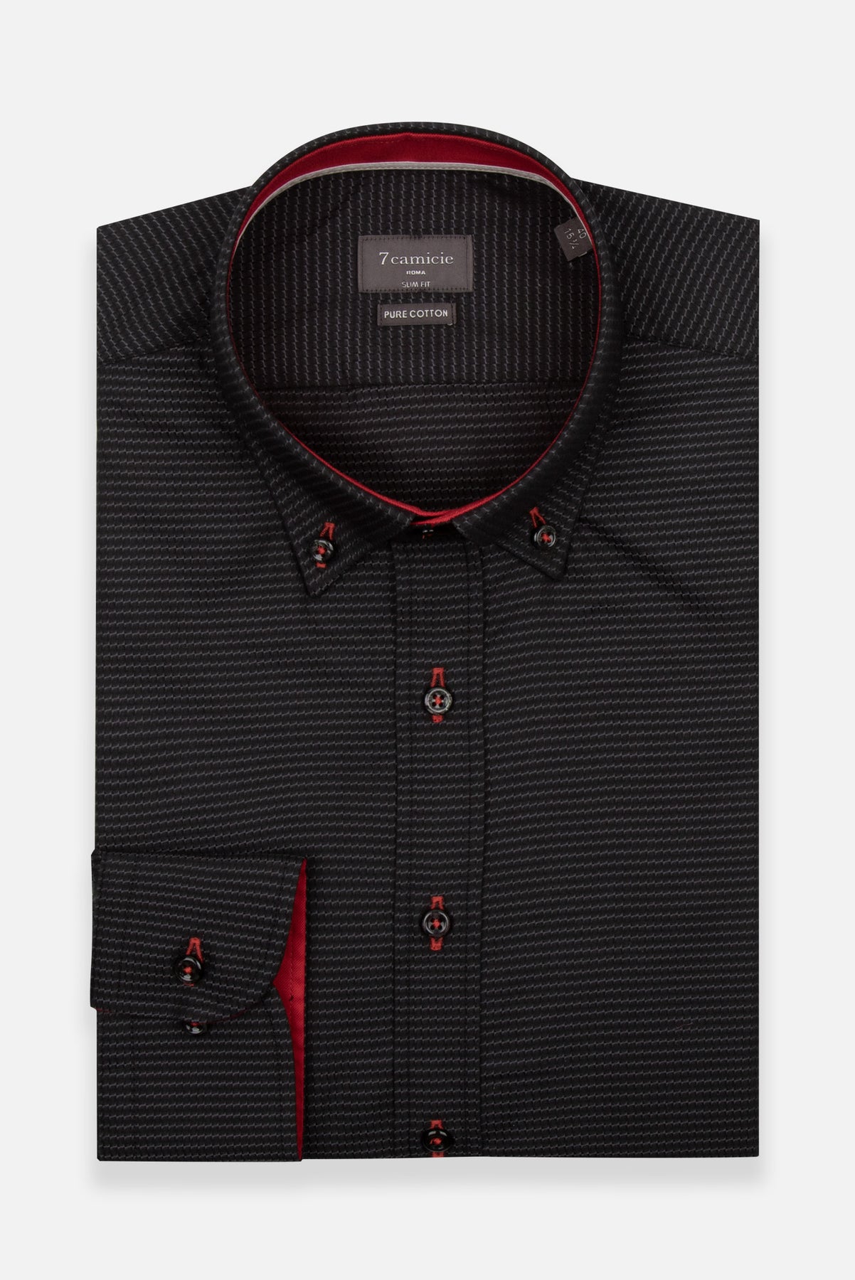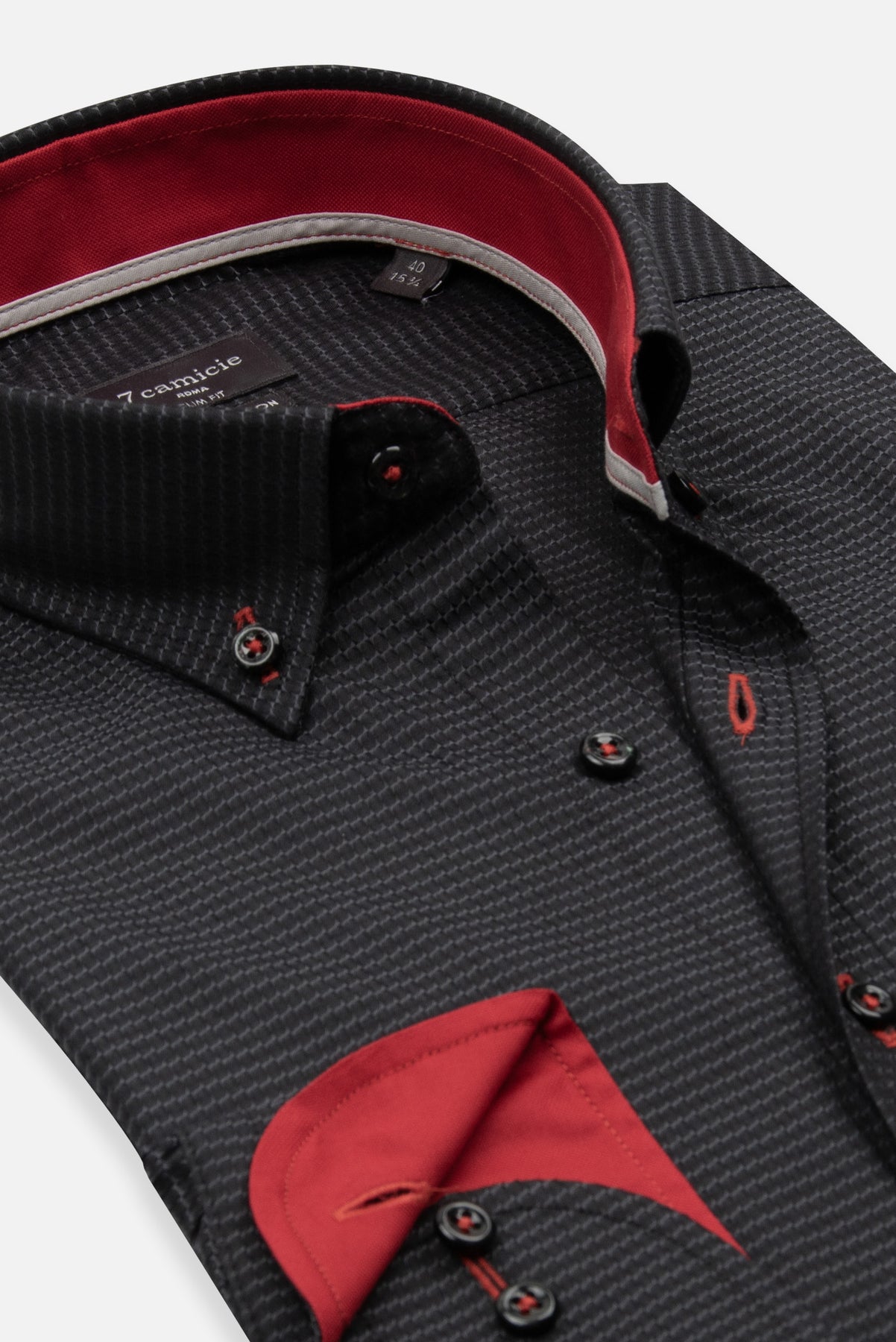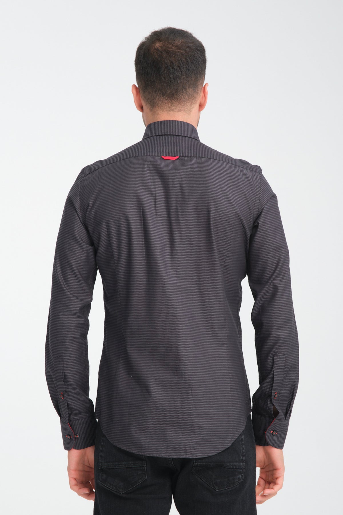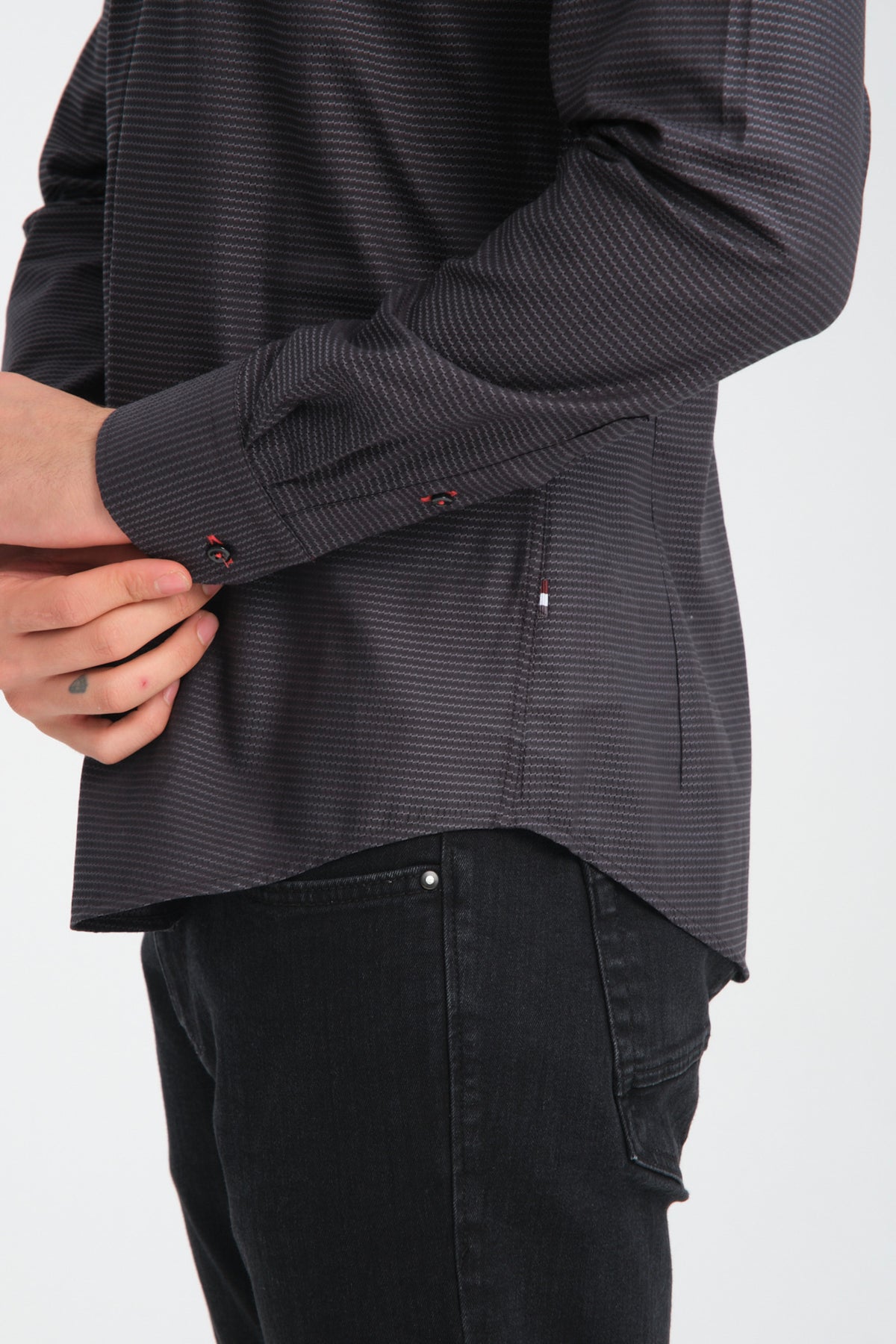 Telirana moška bombažna srajca. Izdelana iz kakovostnega Jacquard materiala, prikazuje prefinjen potisk v črni eleganci. Zapleteno tkanje doda teksturo in globino, kar ustvari edinstven videz, ki zagotovo pritegne pozornost. Srajca ponuja oster in strukturiran videz, obenem pa ohranja sproščen, športen občutek.