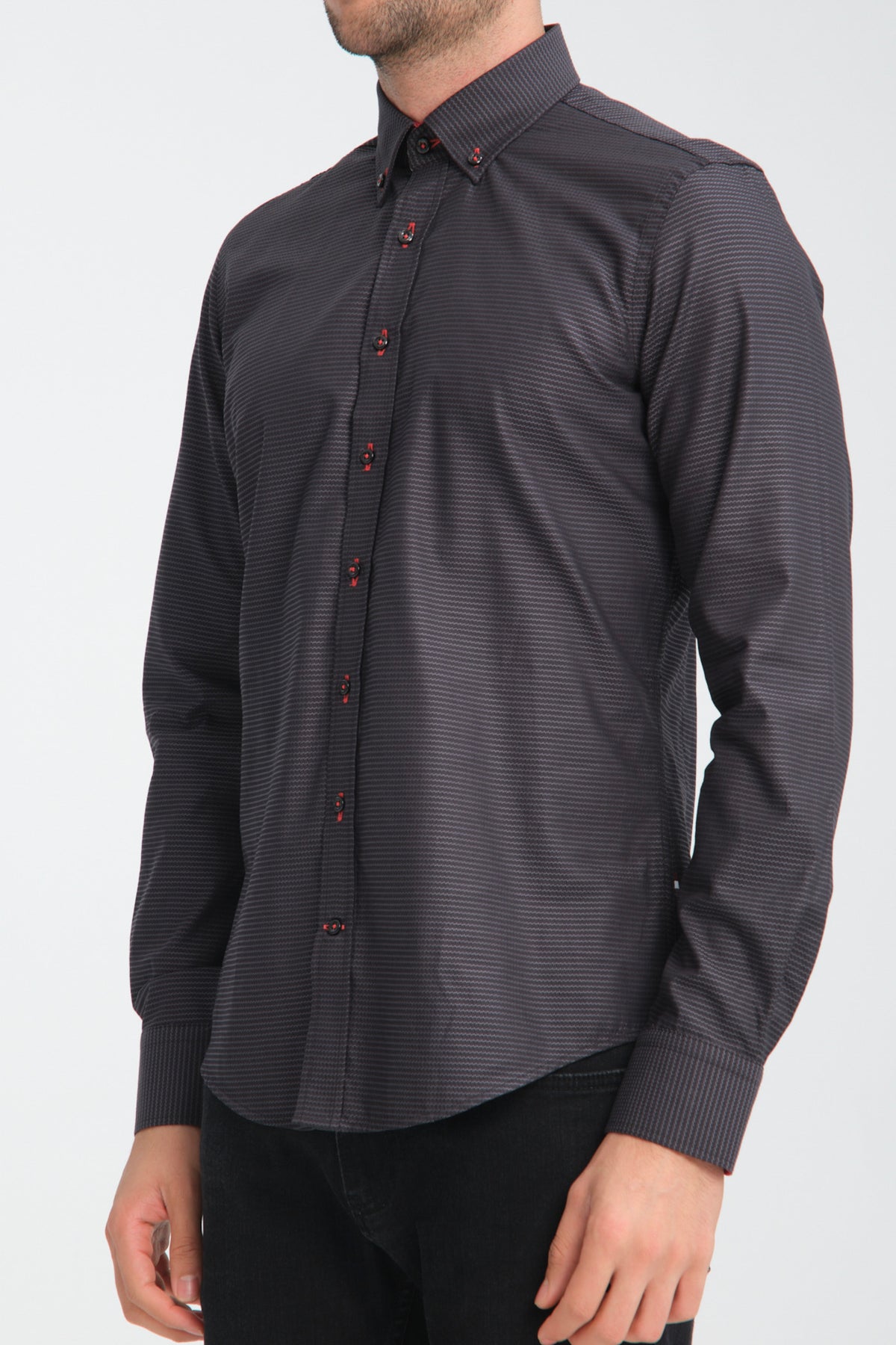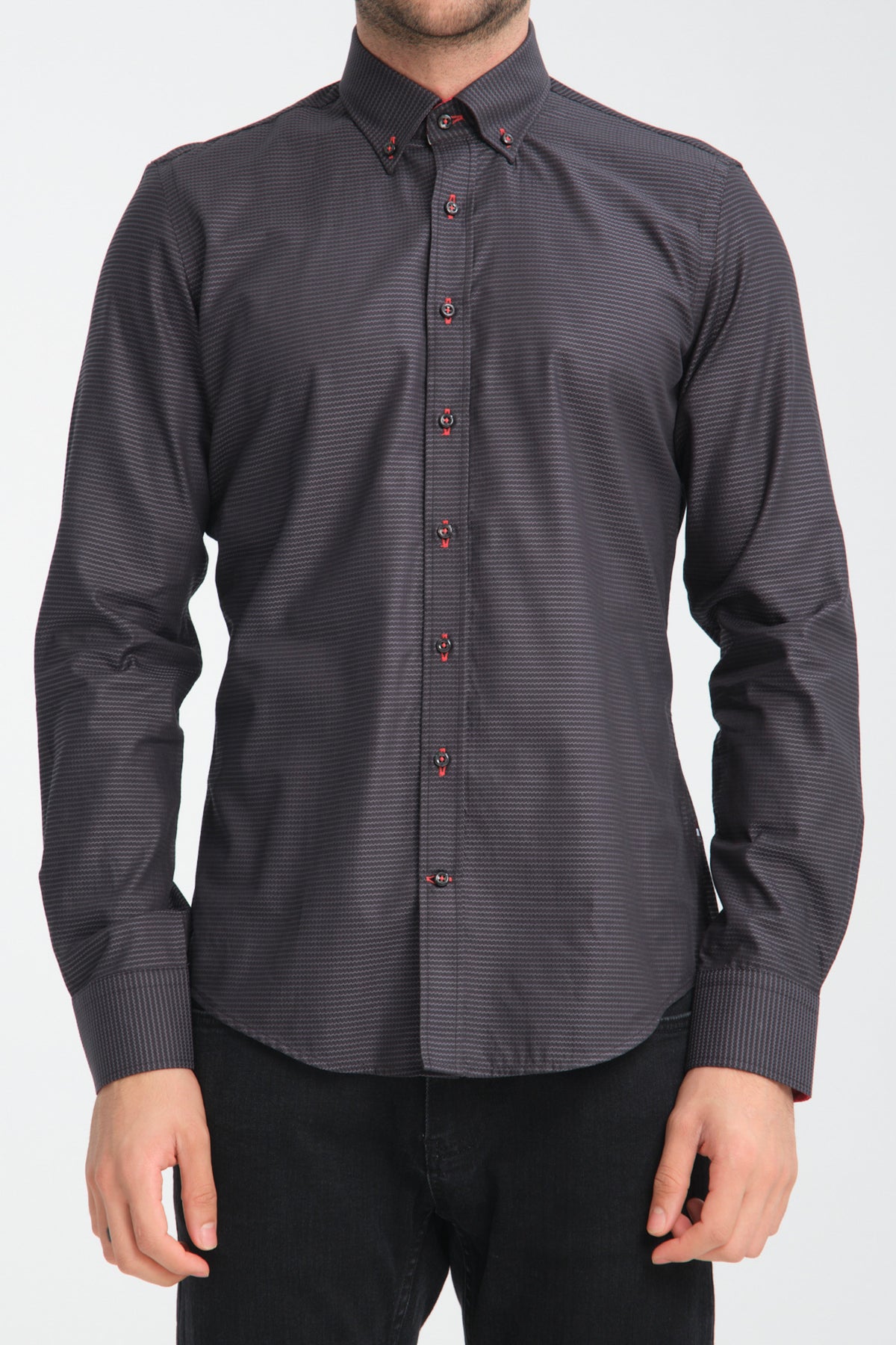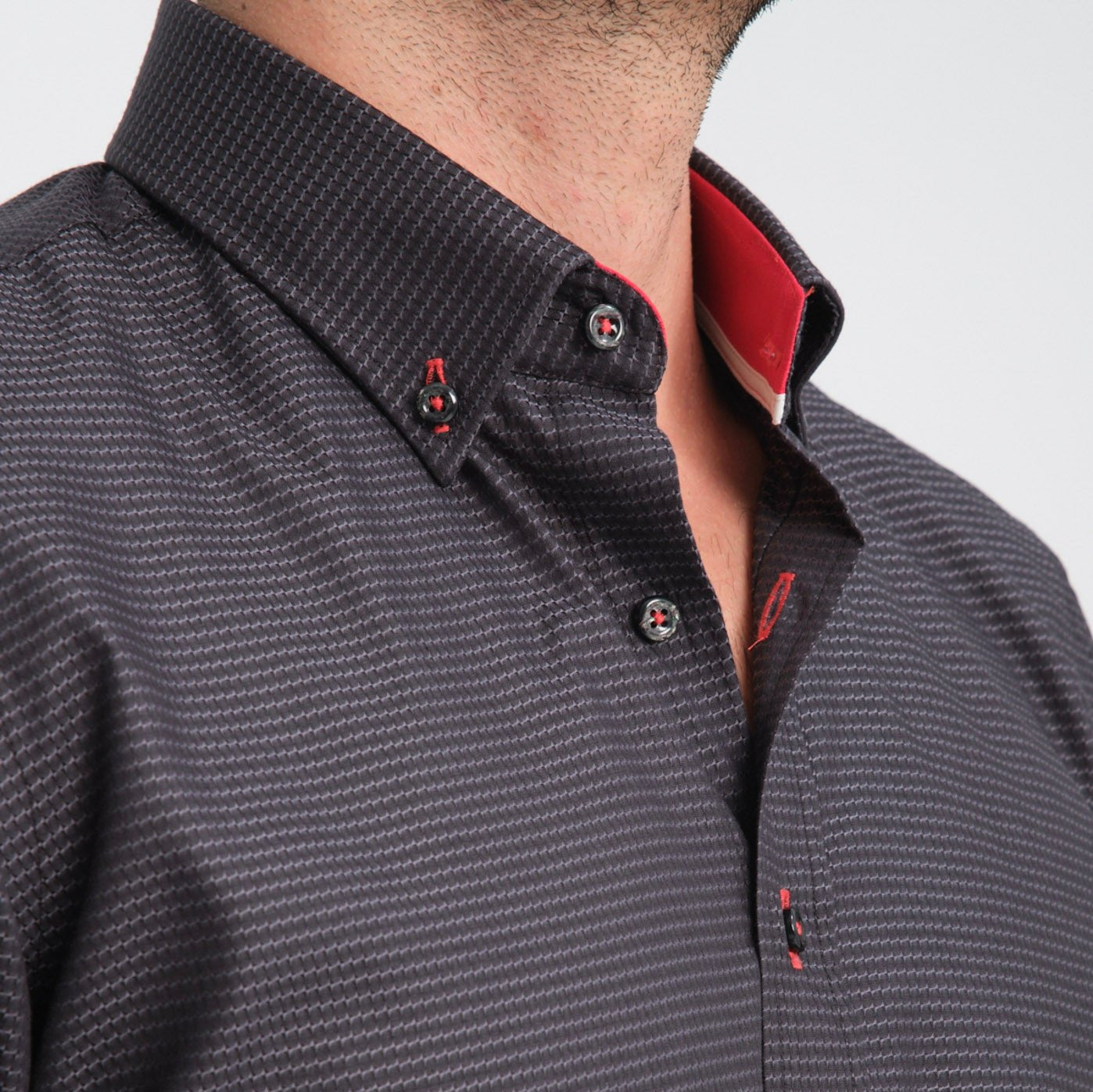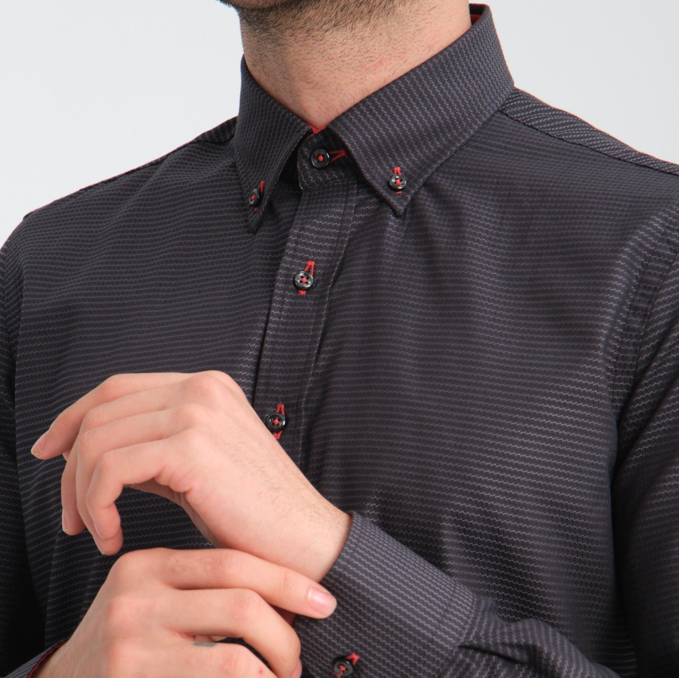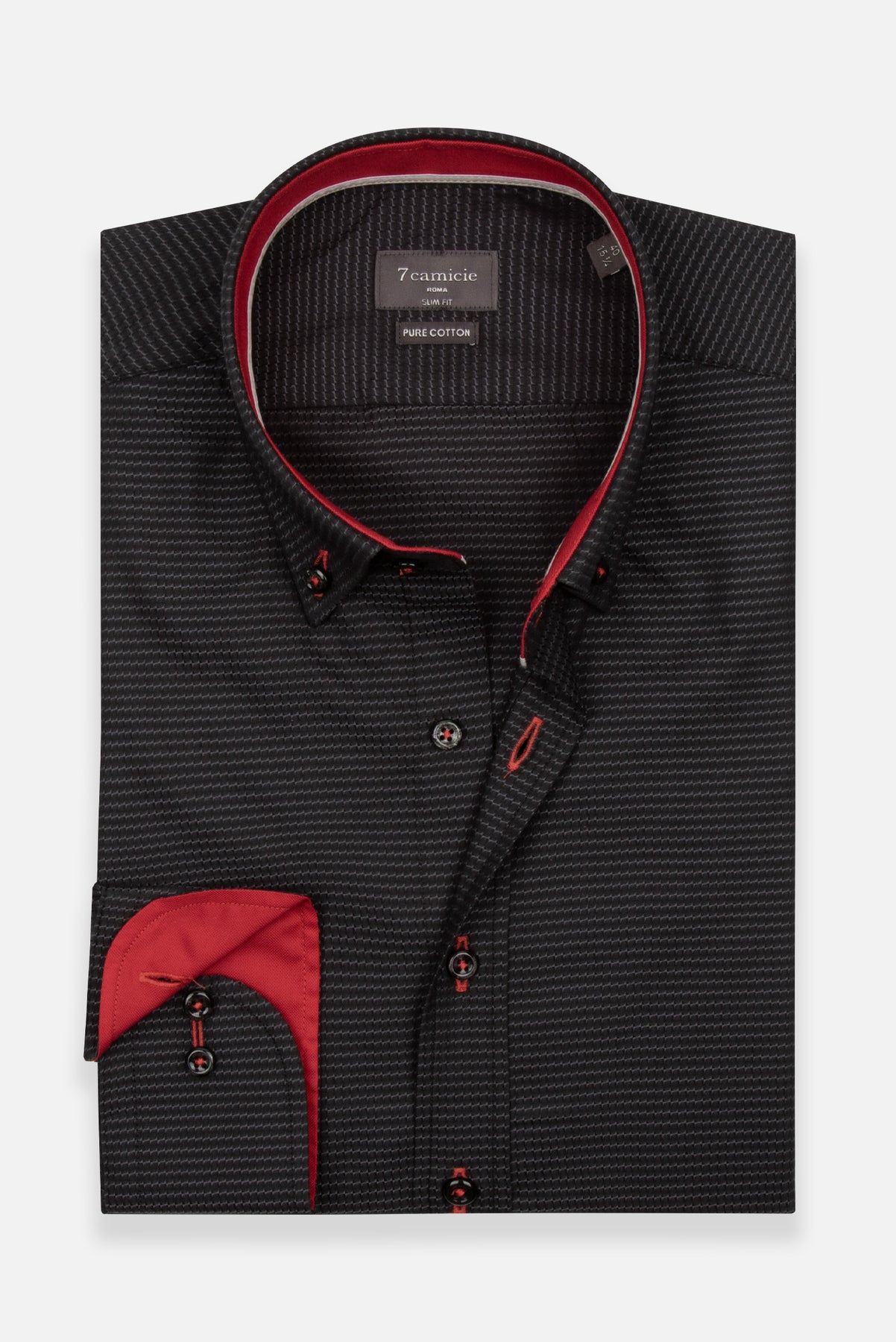 Telirana moška bombažna srajca. Izdelana iz kakovostnega Jacquard materiala, prikazuje prefinjen potisk v črni eleganci. Zapleteno tkanje doda teksturo in globino, kar ustvari edinstven videz, ki zagotovo pritegne pozornost. Srajca ponuja oster in strukturiran videz, obenem pa ohranja sproščen, športen občutek.