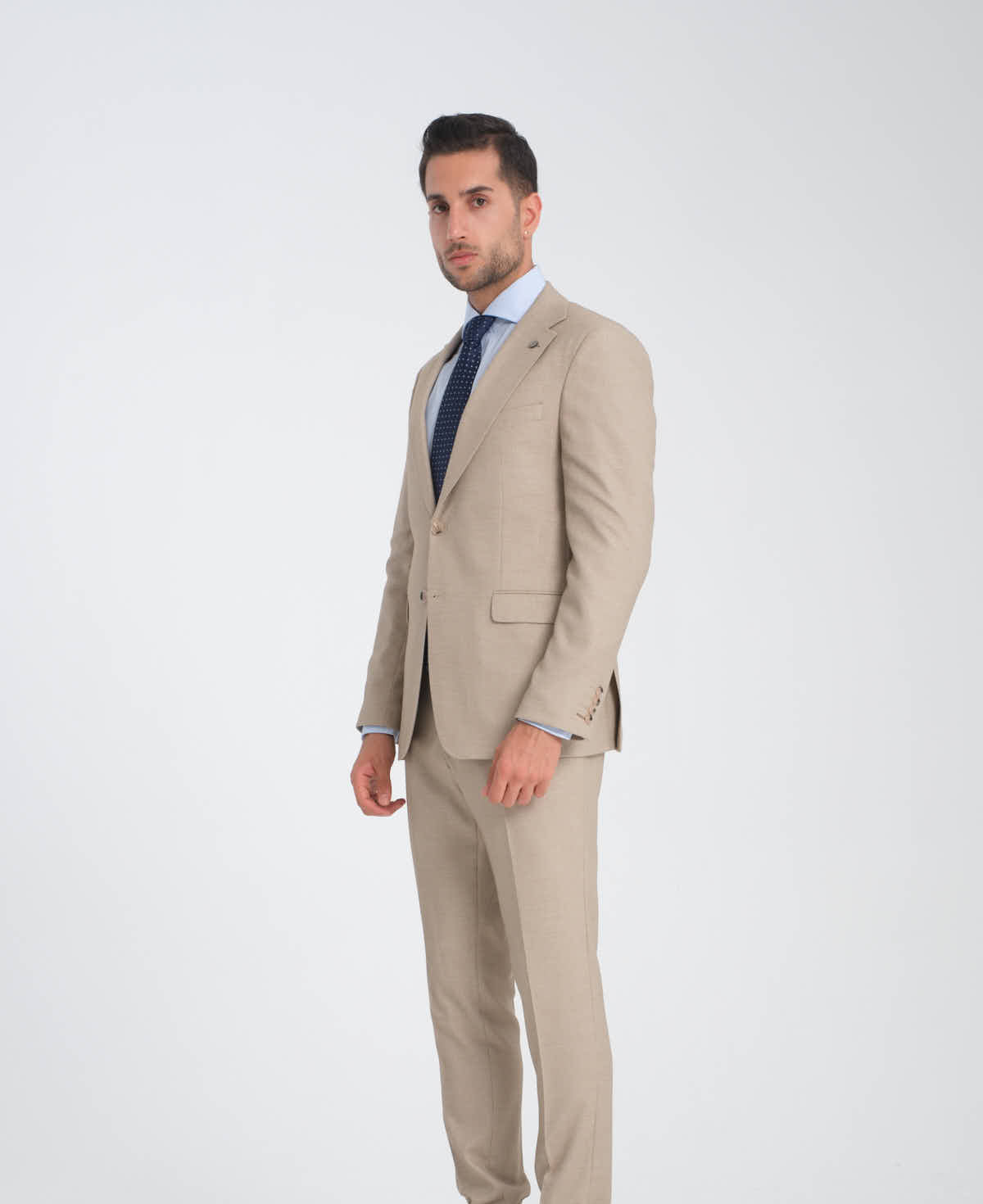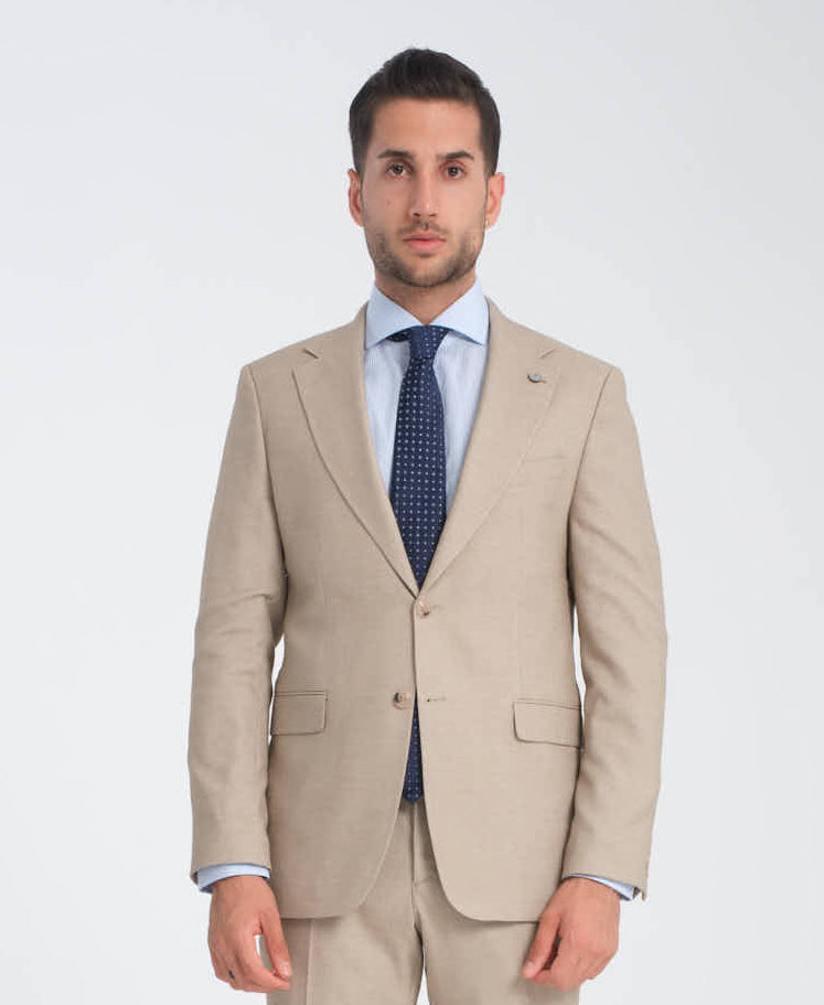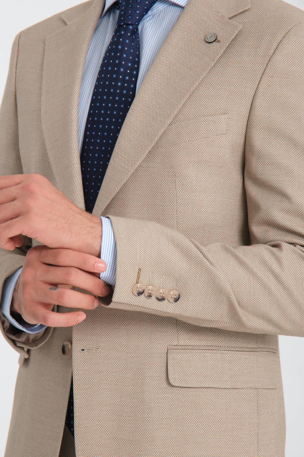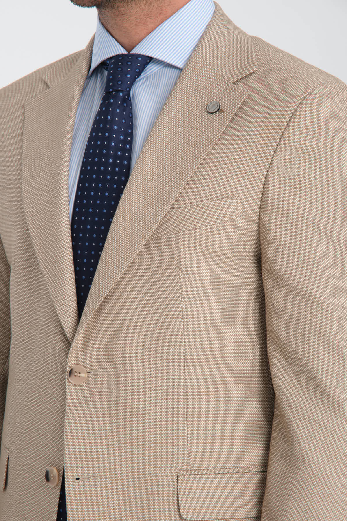 Teliran moški suknjič. Izdelan iz visokokakovostnega materiala z izjemo teksturo, ki pritegne pozornost s subtilnimi detajli. Posebnost so manšete s 4 gumbi, ki poudarijo eleganco in prefinjenost. Izstopajoča značilnost je živahna notranja podloga v drznih oranžnih in rjavih odtenkih kot kontrast minimalistični zunanjosti.