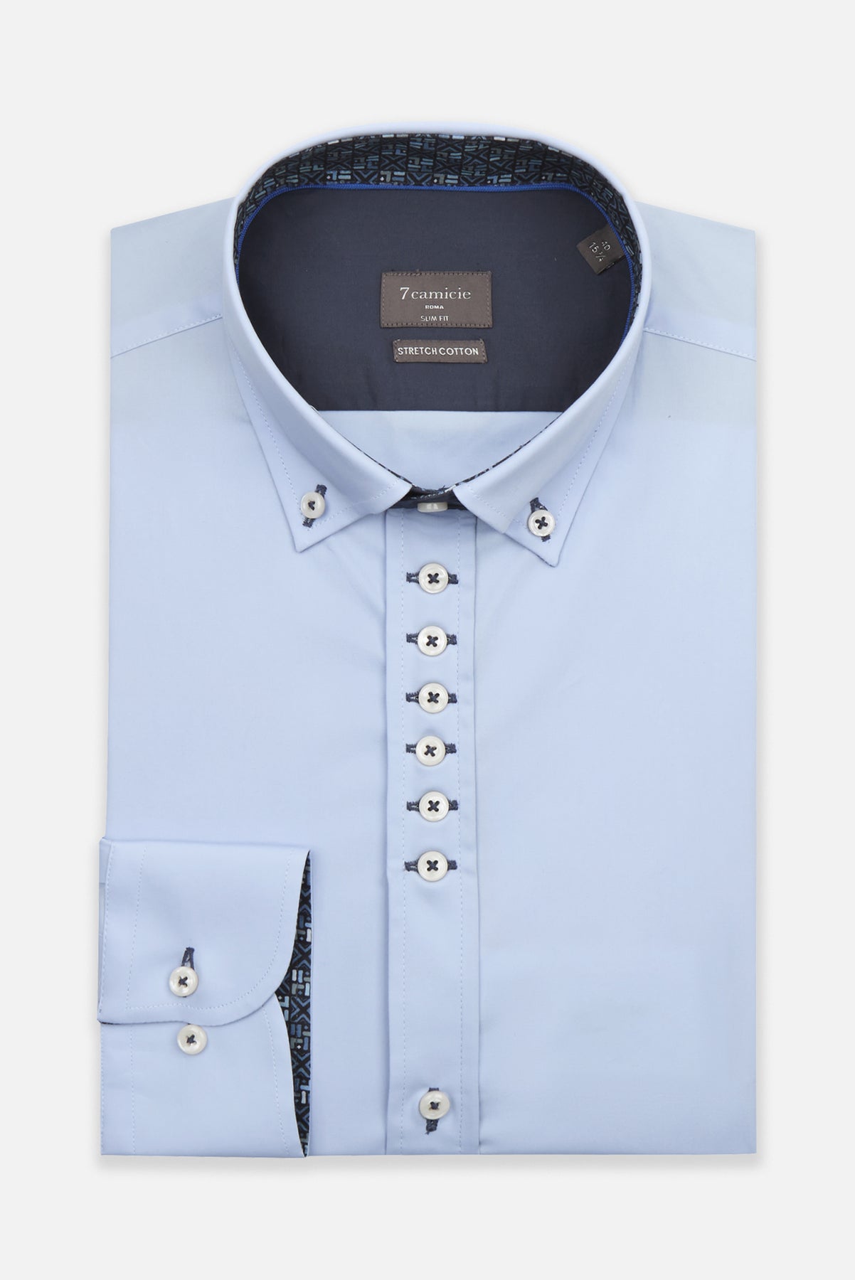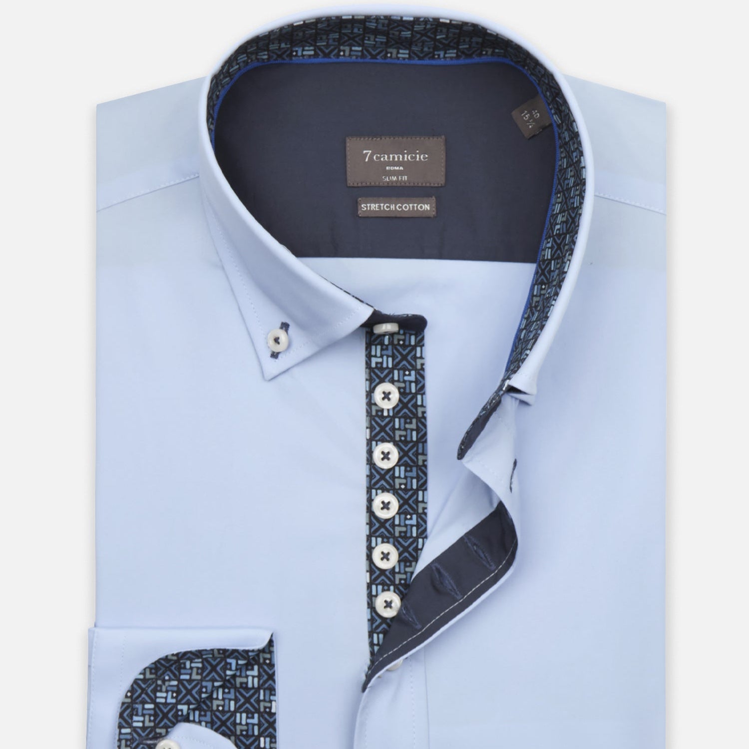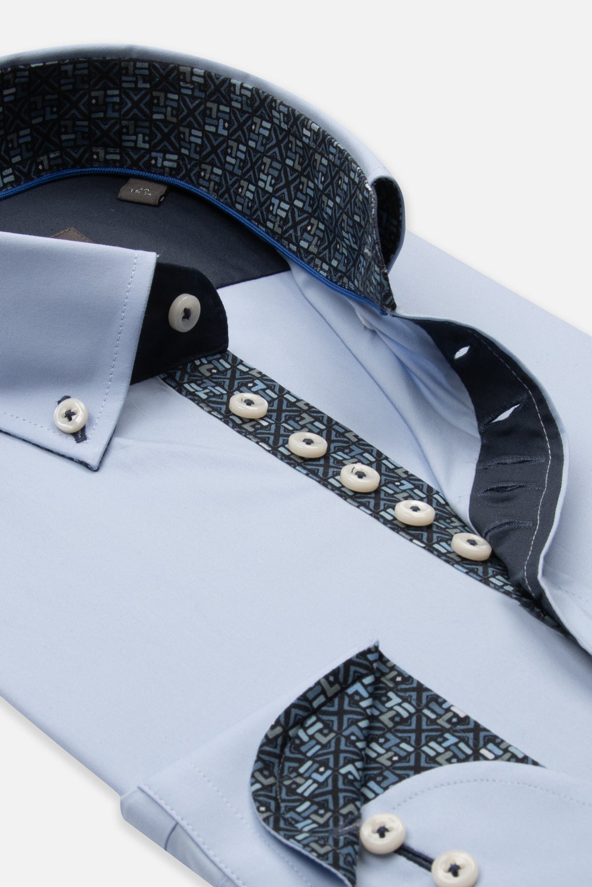 V svetlo modri barvi deluje sveže in prefinjeno, medtem ko temno modri kontrasti ter geometrijski vzorci v notranjosti ovratnika, manšet in vzdolž gumbnic poskrbijo za unikaten, modno dovršen videz. Ti detajli subtilno izstopajo in srajci dajejo sodoben pridih, ki pritegne pogled.