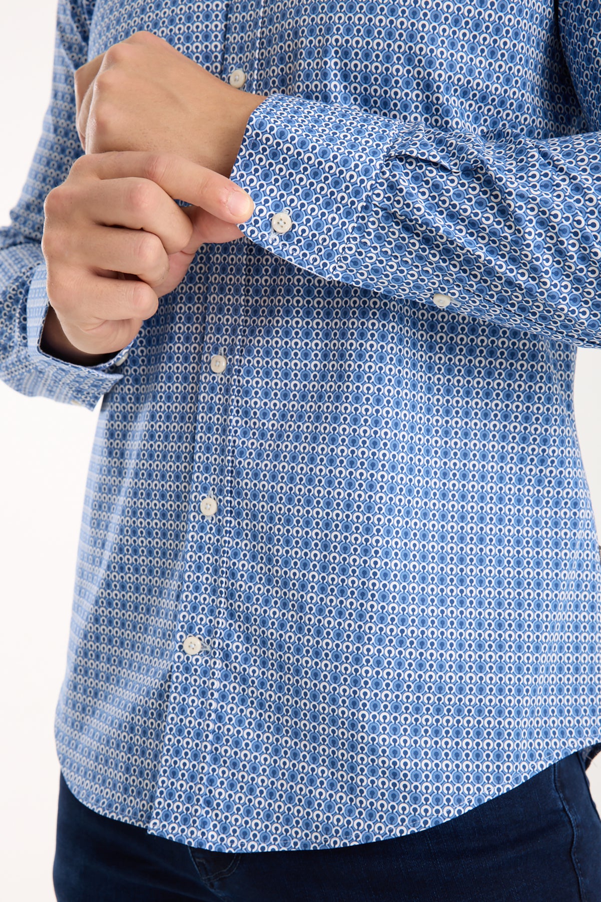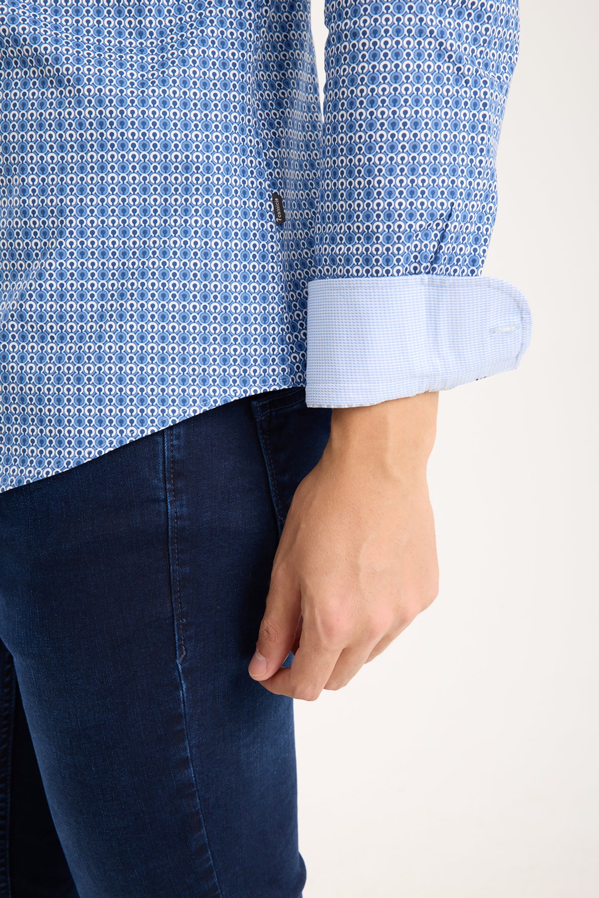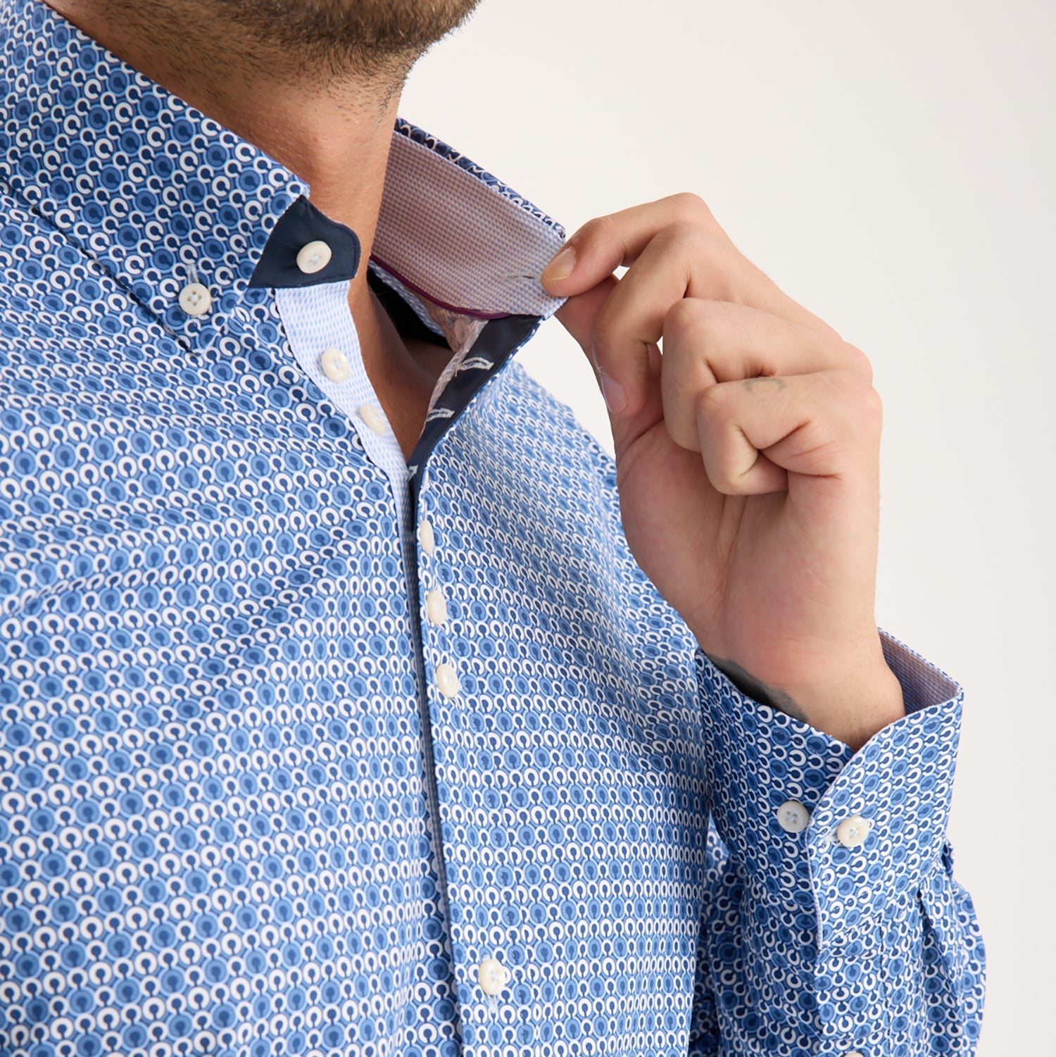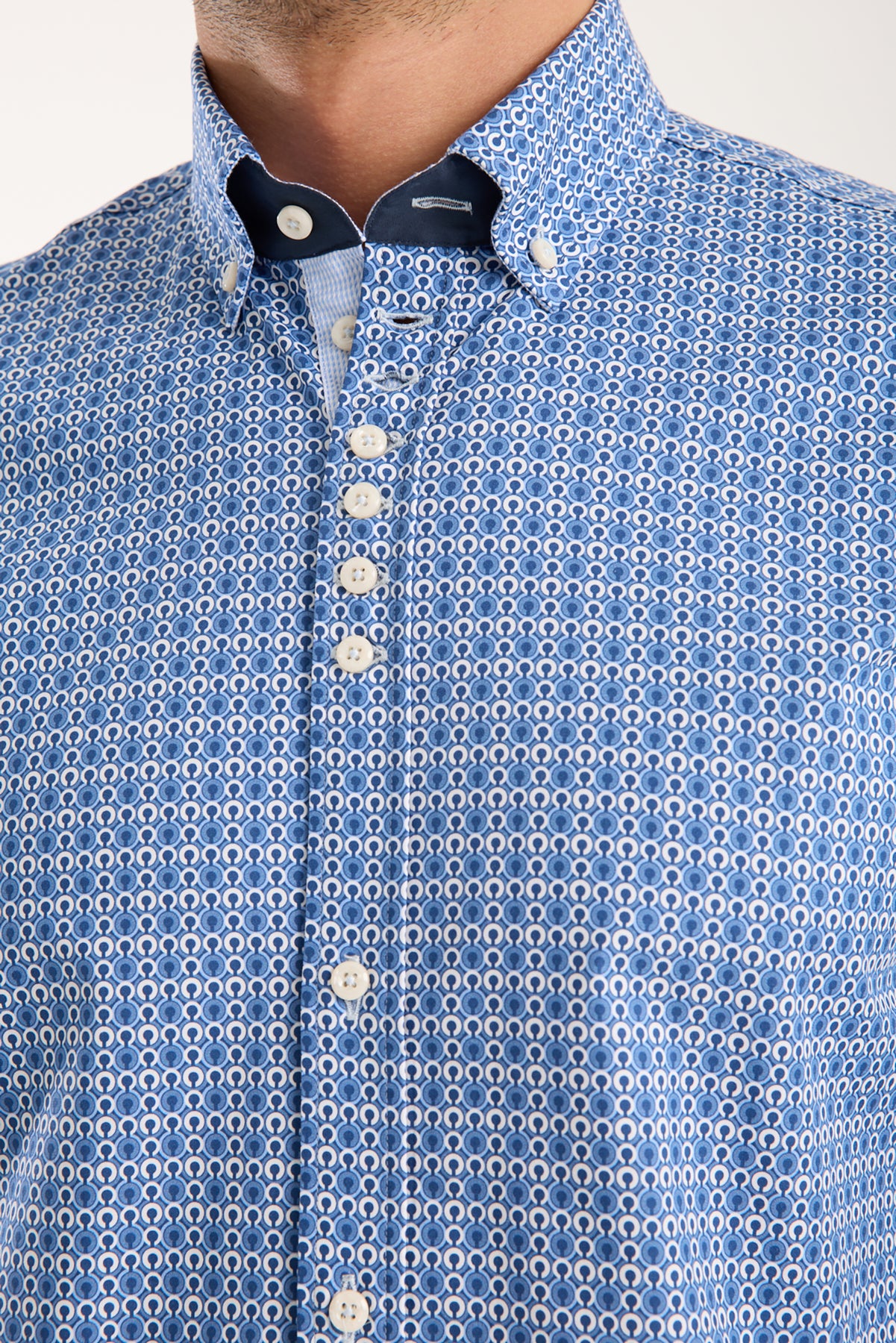 Srajco krasijo očarljivi krogi v svetlo in temno modri ter beli barvi, ki nežno poživijo osnovno modro tkanino in ji dodajo igriv, a hkrati uglajen pridih. Ta subtilen vzorec naredi srajco unikaten kos, primeren za vse, ki želijo izstopati brez pretiranosti.