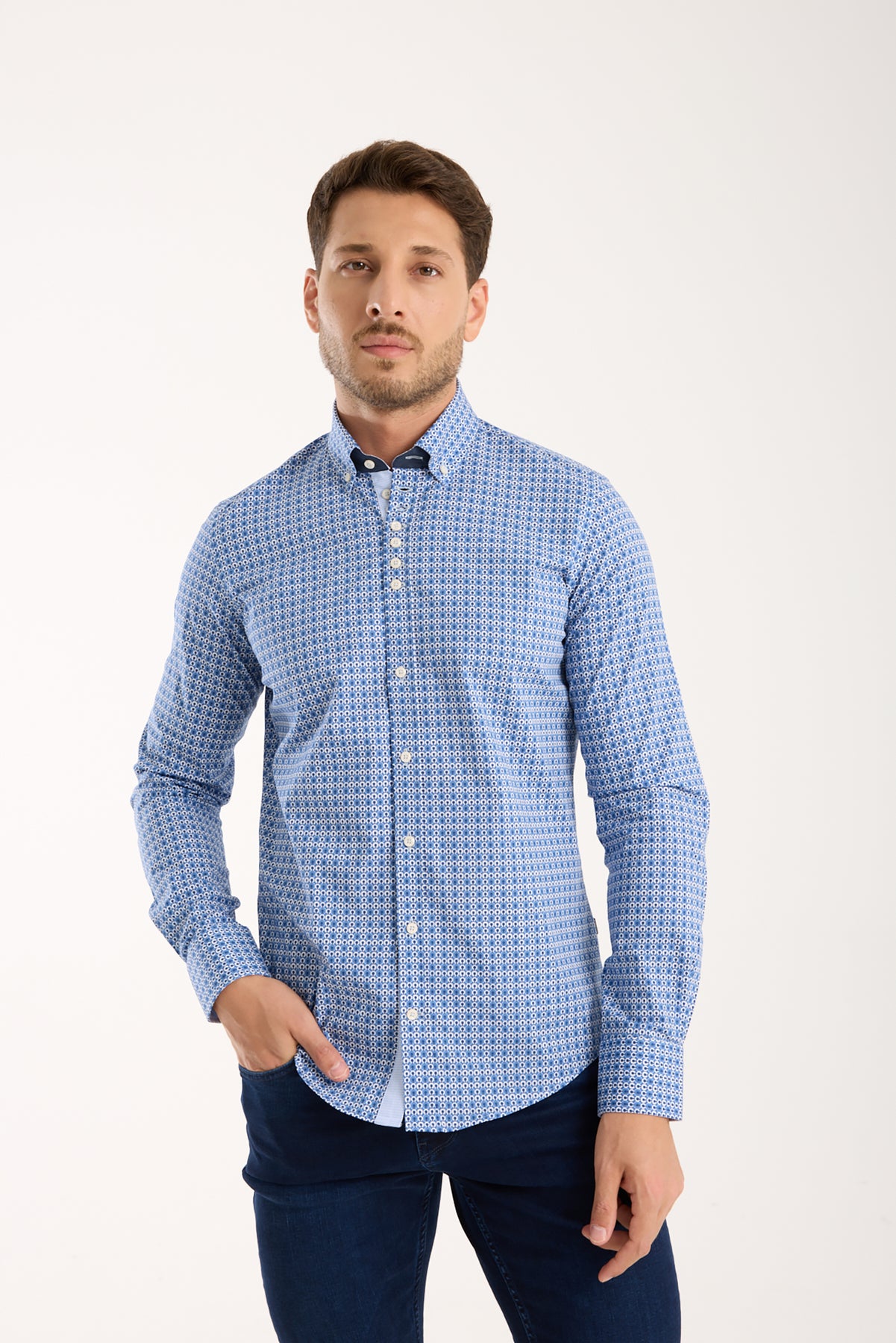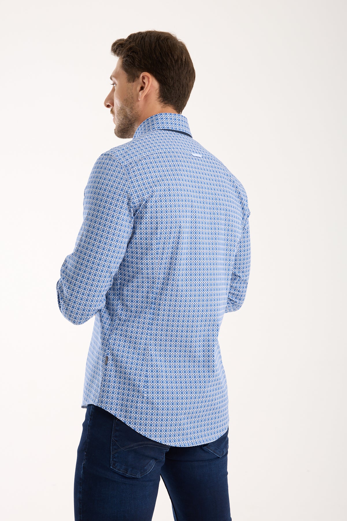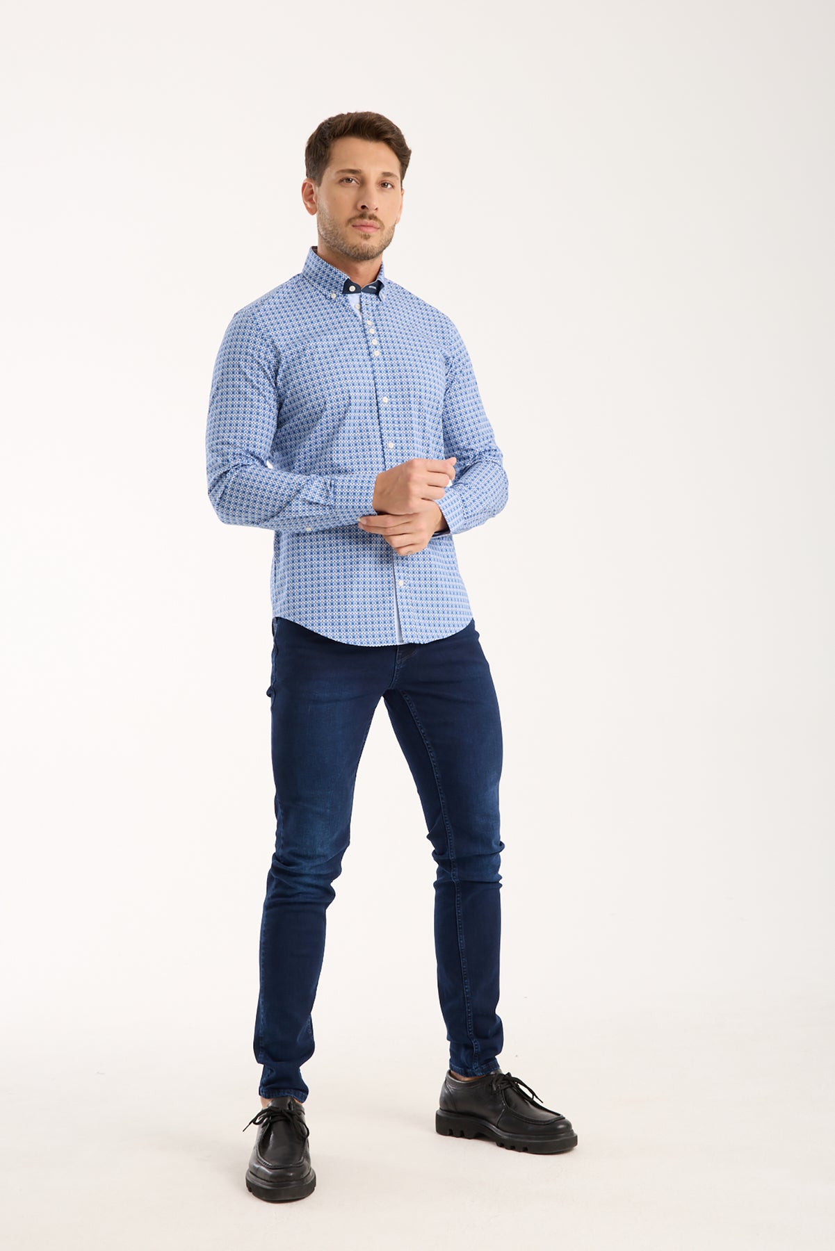Srajco krasijo očarljivi krogi v svetlo in temno modri ter beli barvi, ki nežno poživijo osnovno modro tkanino in ji dodajo igriv, a hkrati uglajen pridih. Ta subtilen vzorec naredi srajco unikaten kos, primeren za vse, ki želijo izstopati brez pretiranosti.