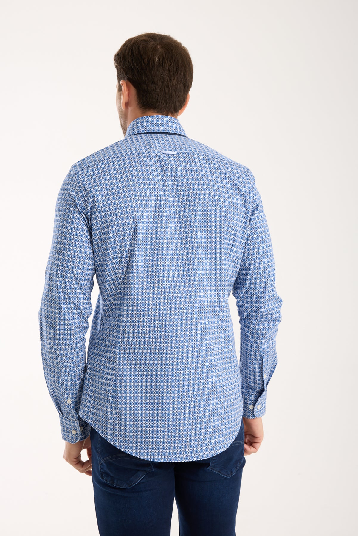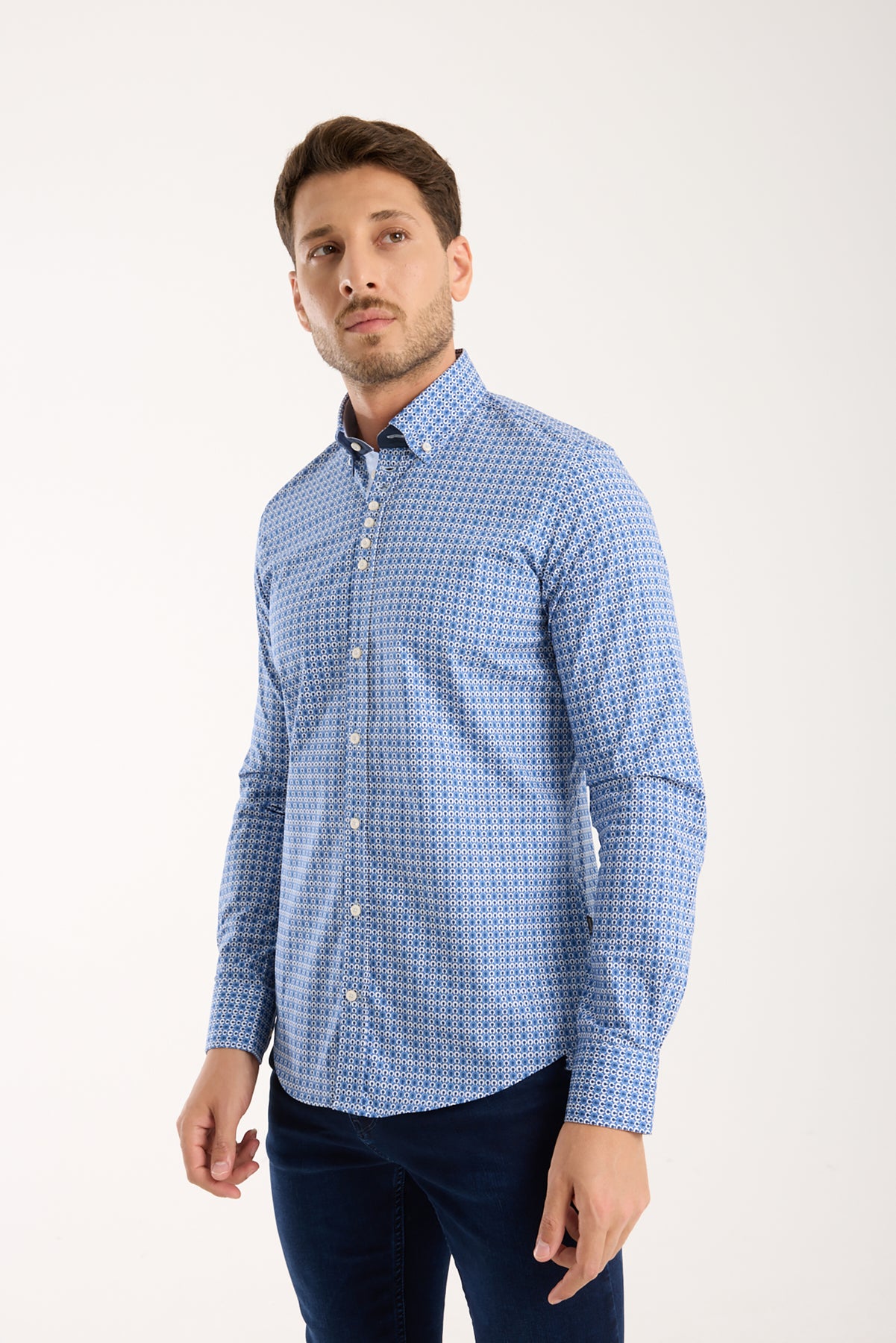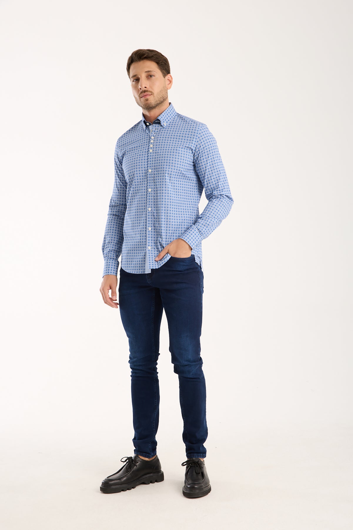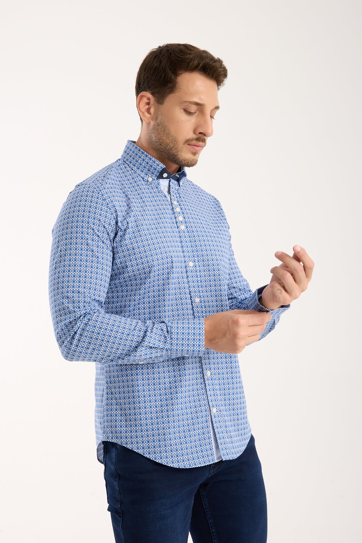 Srajco krasijo očarljivi krogi v svetlo in temno modri ter beli barvi, ki nežno poživijo osnovno modro tkanino in ji dodajo igriv, a hkrati uglajen pridih. Ta subtilen vzorec naredi srajco unikaten kos, primeren za vse, ki želijo izstopati brez pretiranosti.
