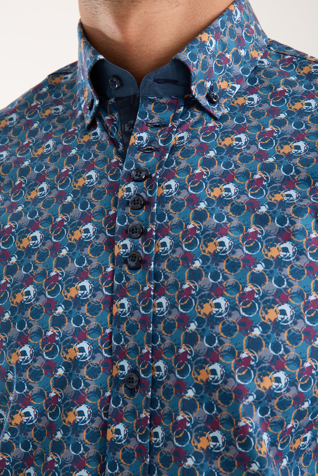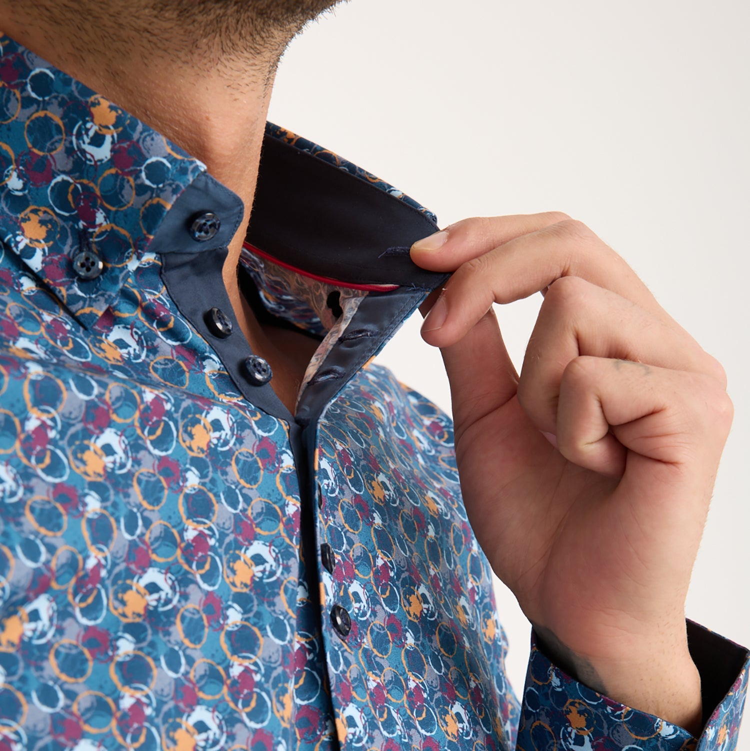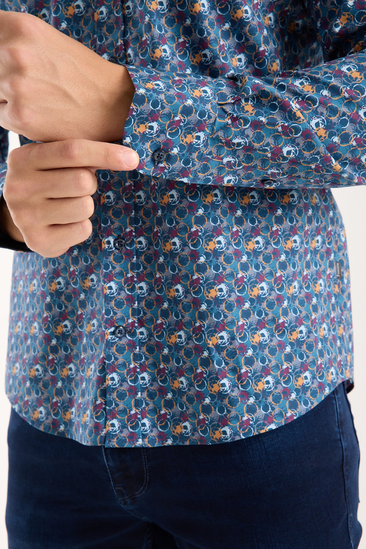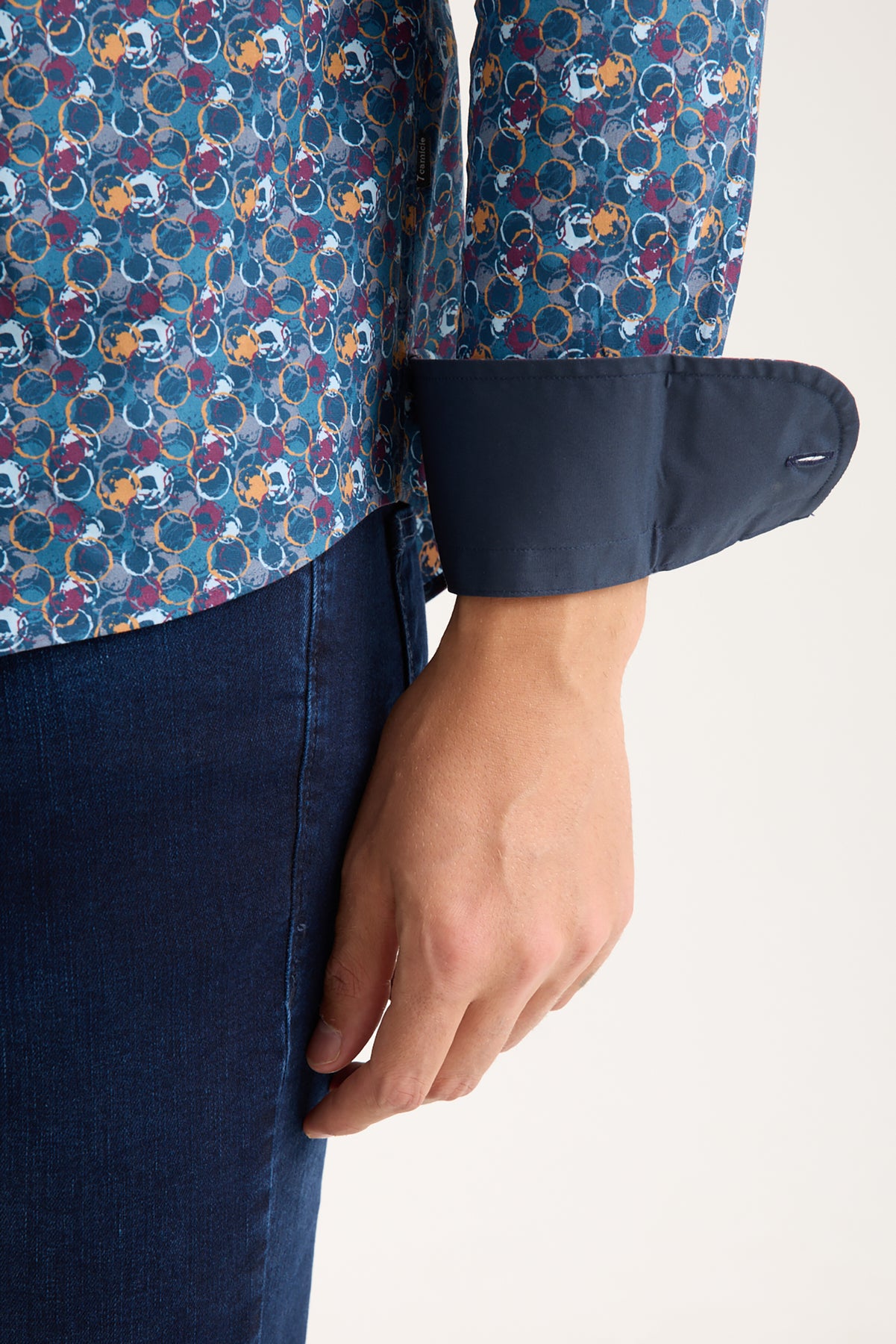 Posebnost srajce je njen očarljiv vzorec – osnovna modra barva je živahno dopolnjena s krogi v svetlo modri, rumeni in bordo rdeči barvi, ki vnašajo igriv, a prefinjen detajl. Ta subtilen dizajn doda srajci osebnost in jo loči od povprečnih kosov.