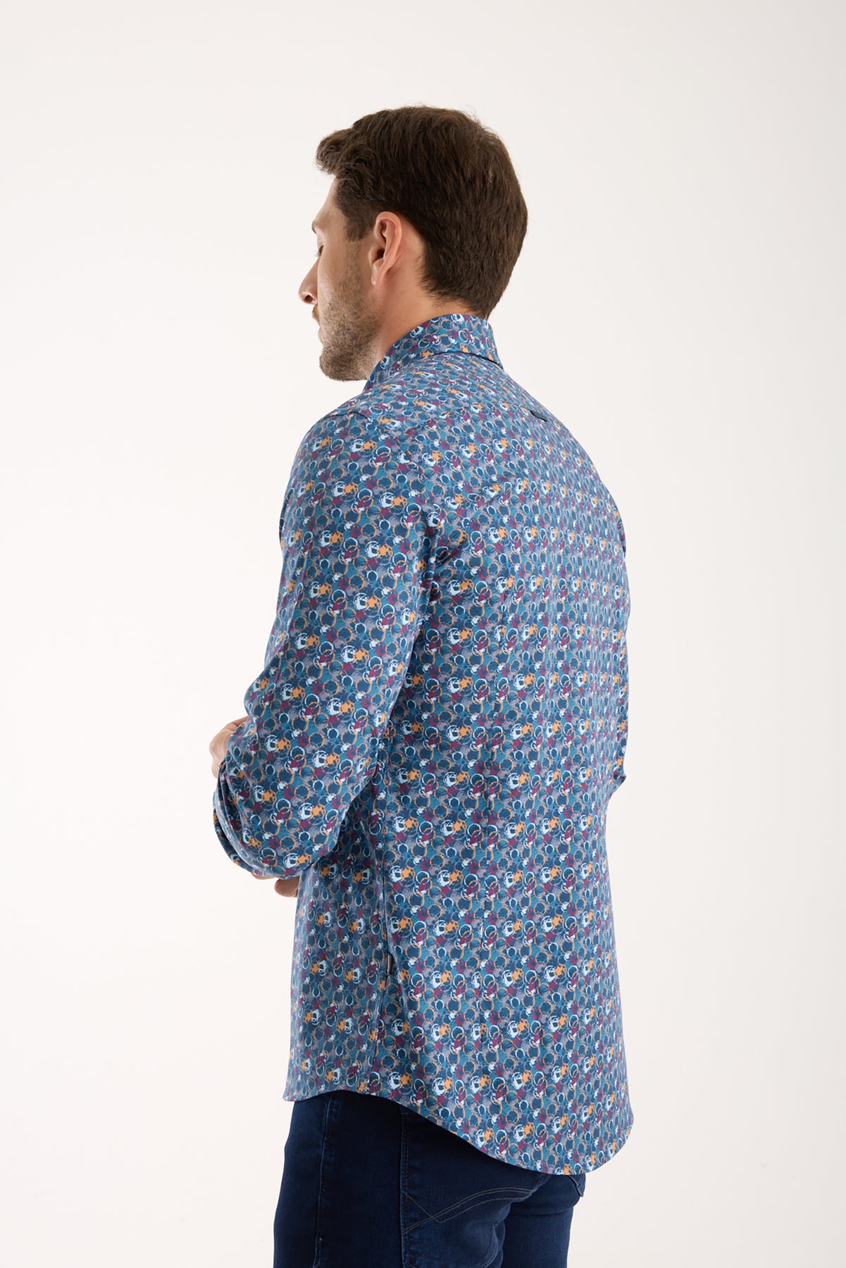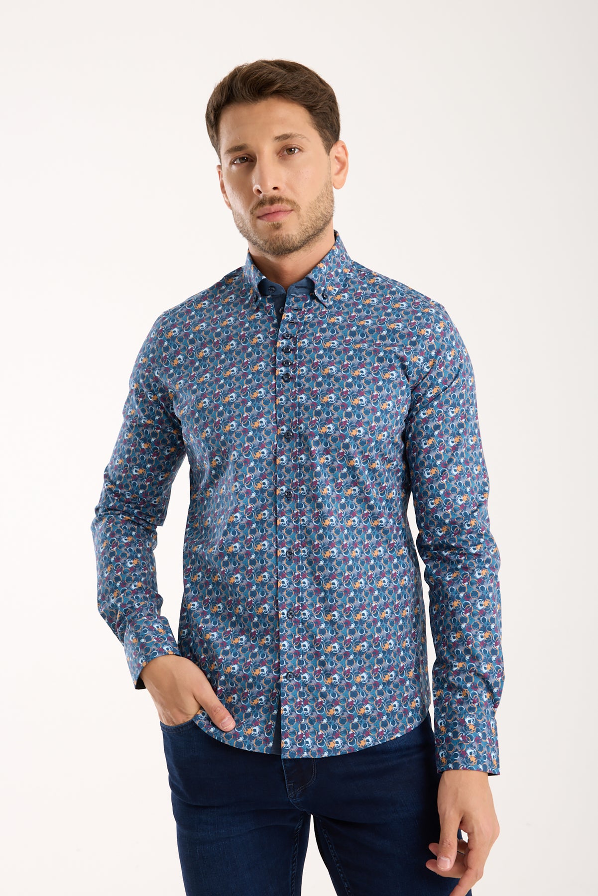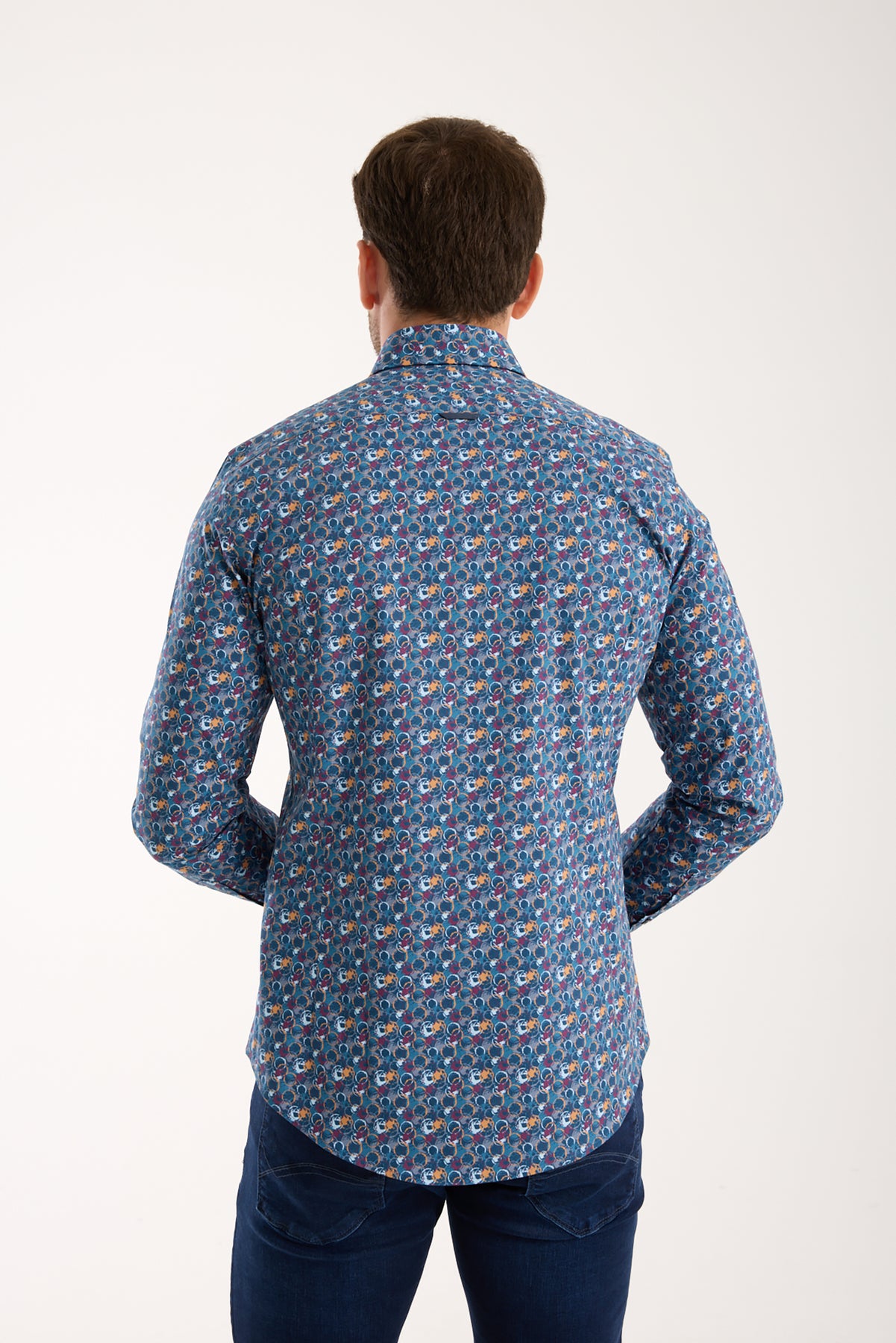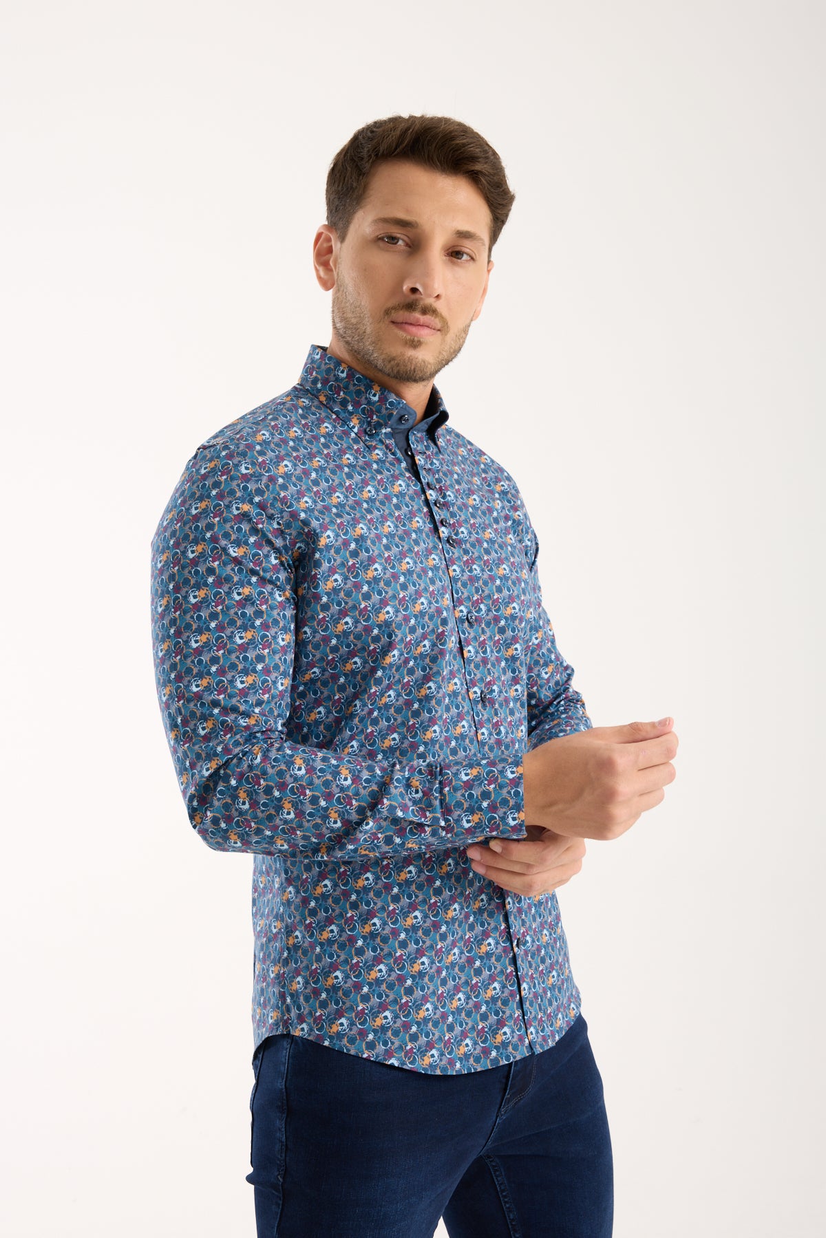 Posebnost srajce je njen očarljiv vzorec – osnovna modra barva je živahno dopolnjena s krogi v svetlo modri, rumeni in bordo rdeči barvi, ki vnašajo igriv, a prefinjen detajl. Ta subtilen dizajn doda srajci osebnost in jo loči od povprečnih kosov.