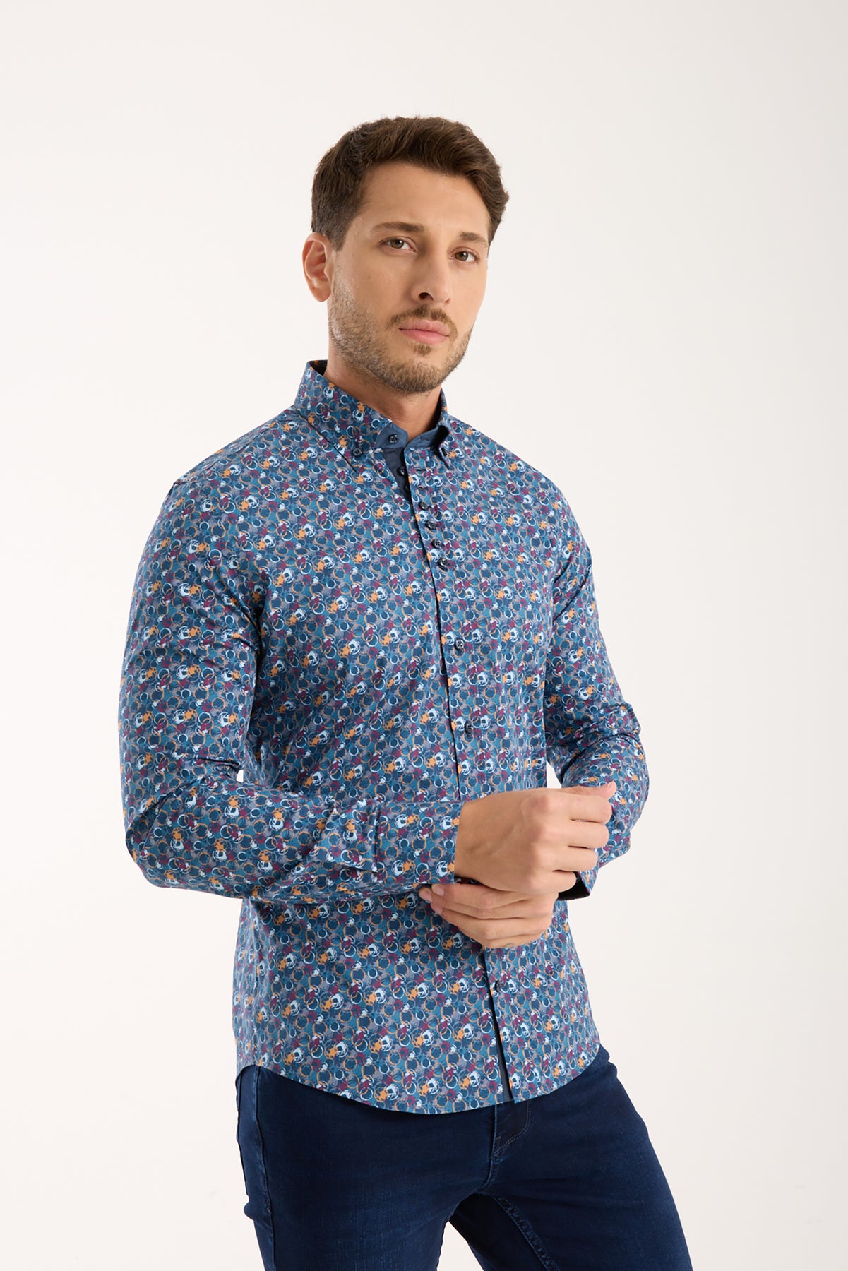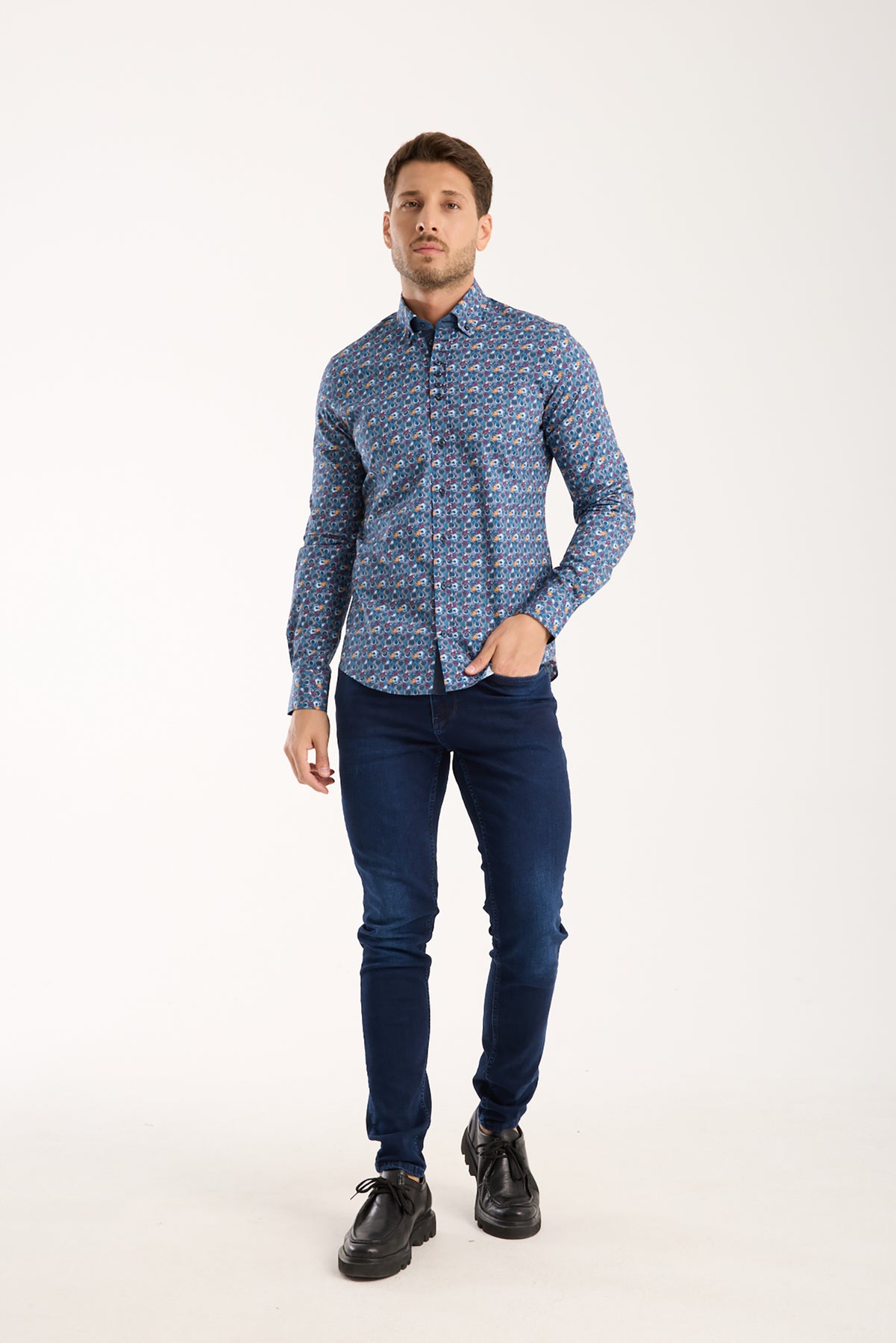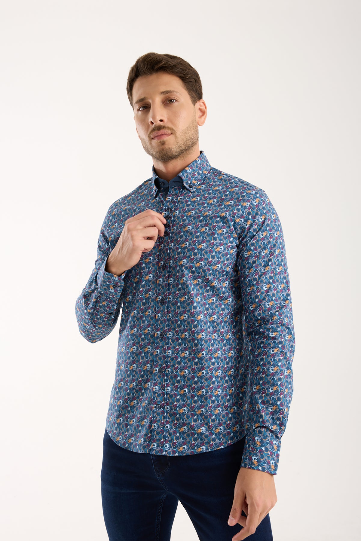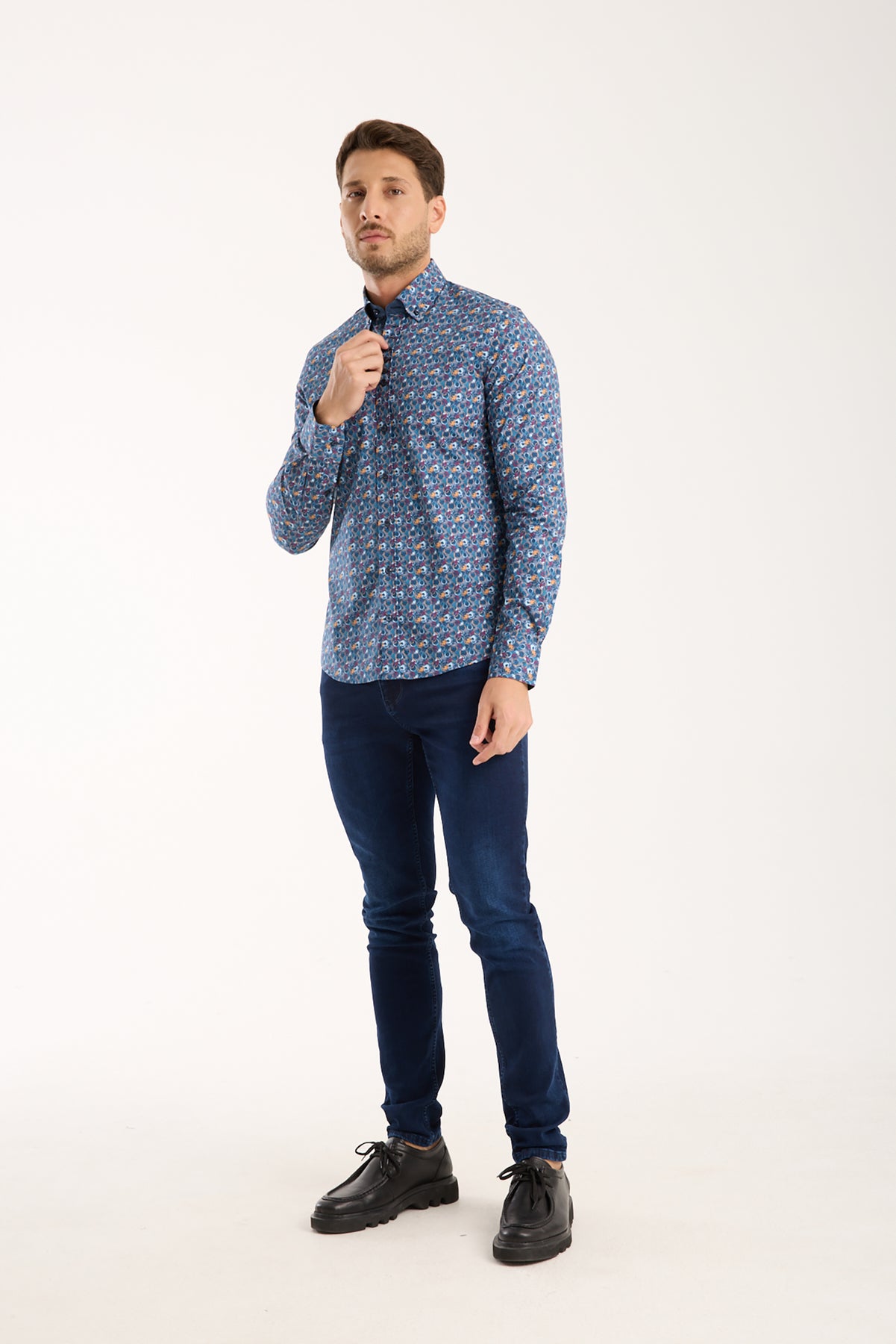 Posebnost srajce je njen očarljiv vzorec – osnovna modra barva je živahno dopolnjena s krogi v svetlo modri, rumeni in bordo rdeči barvi, ki vnašajo igriv, a prefinjen detajl. Ta subtilen dizajn doda srajci osebnost in jo loči od povprečnih kosov.