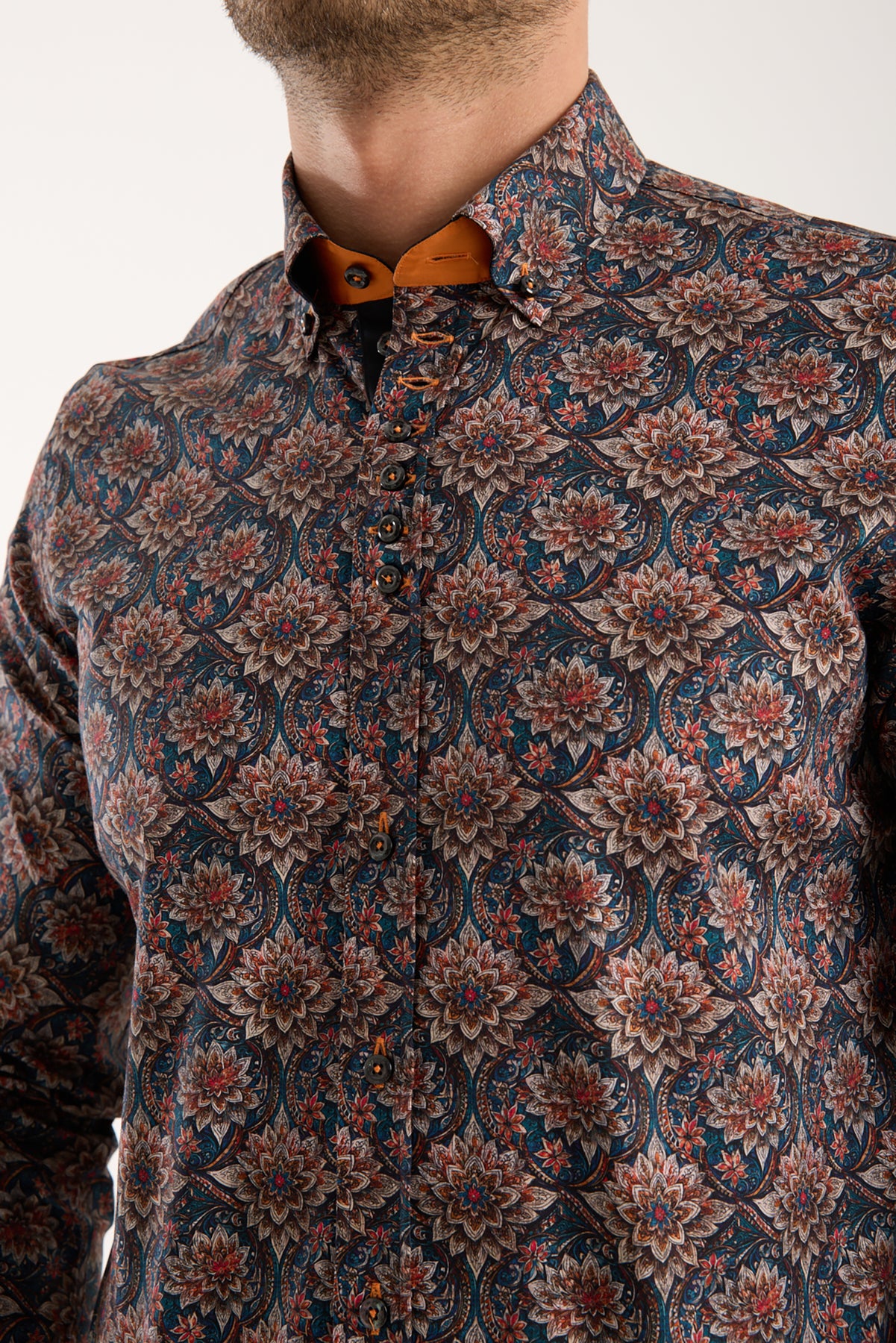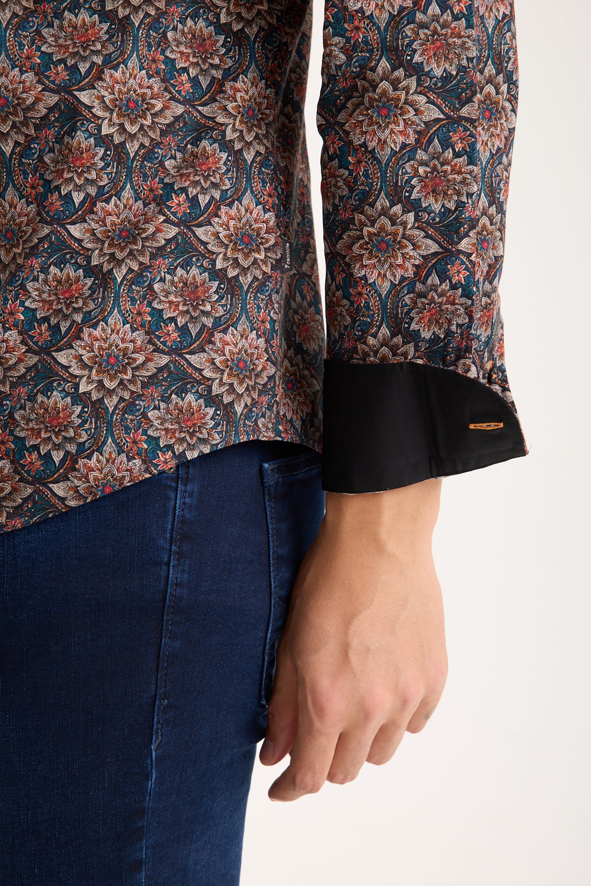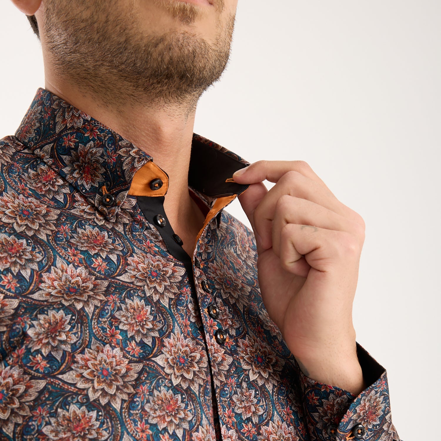 Vzorci, ki spominjajo na cvetove lotusa, se prepletajo v odtenkih modre, sive in oranžne barve, obogateni s črnimi in nežno oranžnimi detajli. Rezultat je harmoničen, a izrazit videz, ki pritegne poglede in izžareva samozavest brez pretiravanja.