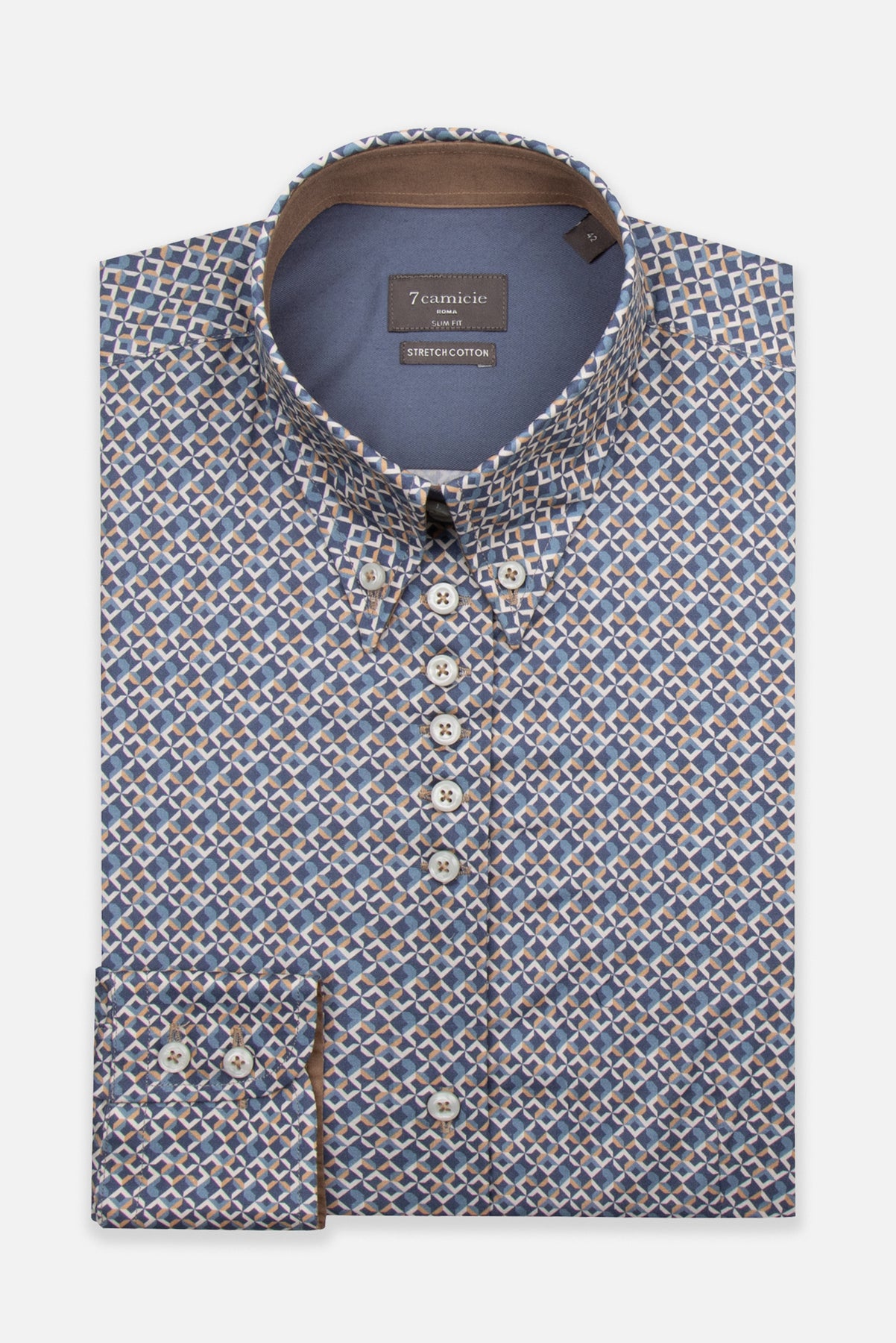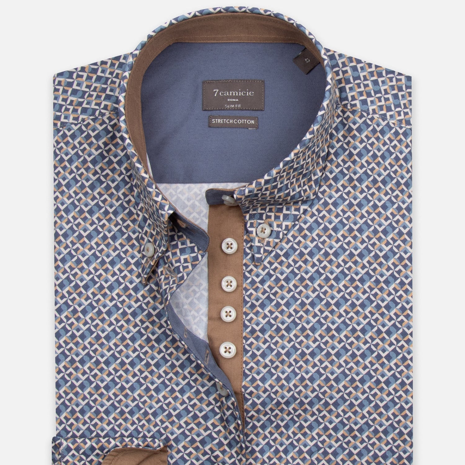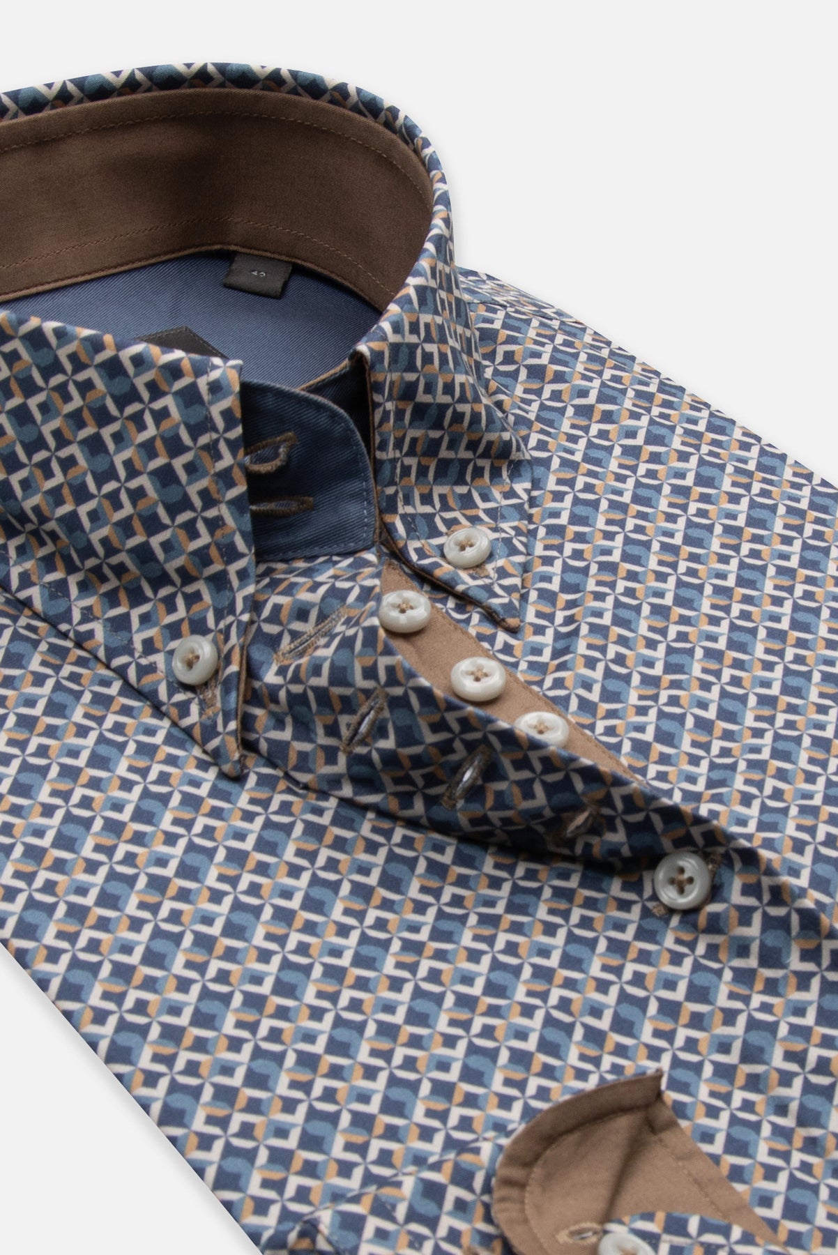 Posebnost srajce je njen geometrijski vzorec v odtenkih modre, bež in rjave barve. Vzorec ustvarja prefinjen optični učinek, ki izžareva eleganco in sodobno estetiko. Notranjost ovratnika, manšet in gumbnice je poudarjena z gladko rjavo tkanino, ki s subtilnim kontrastom doda pridih prefinjenosti.
