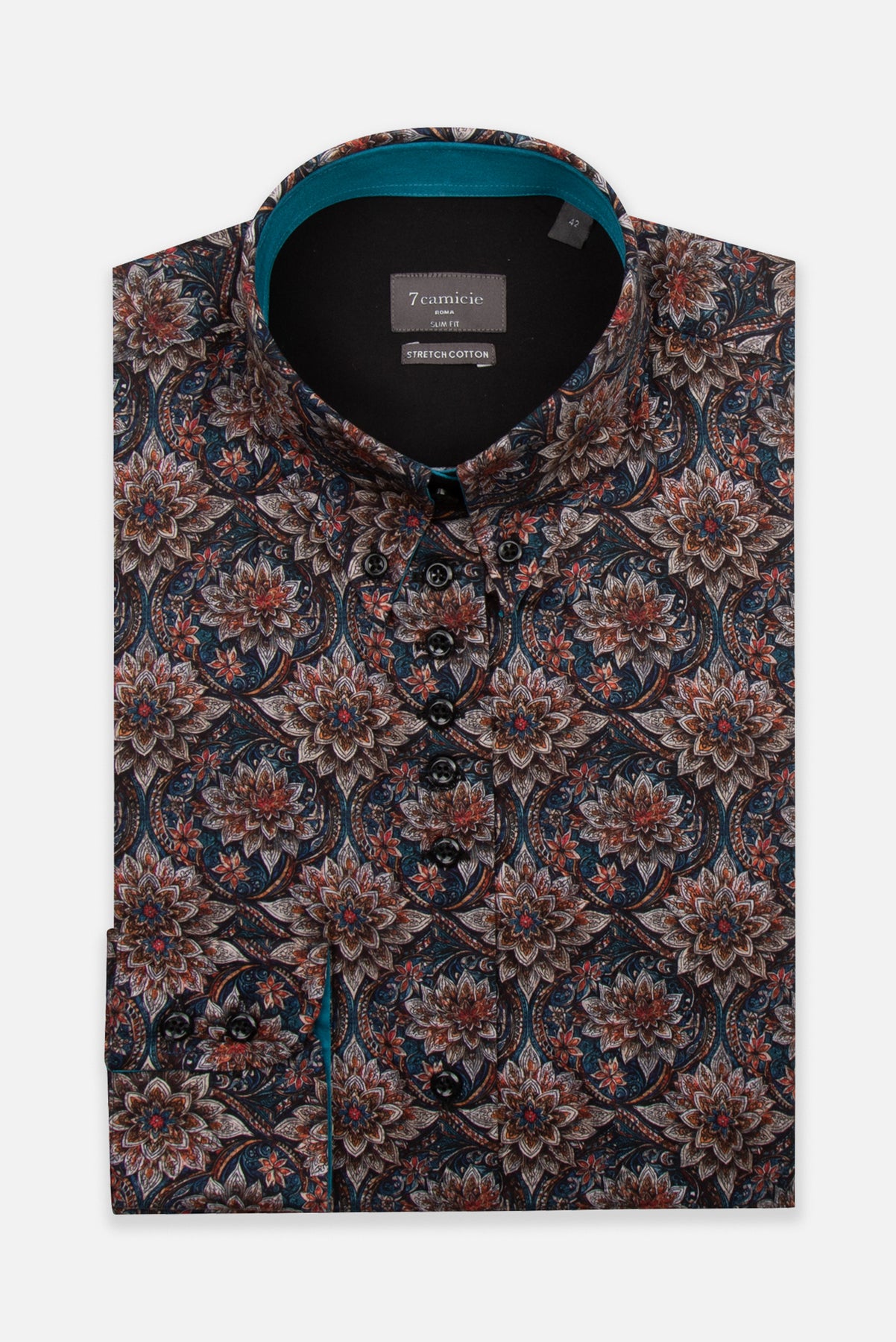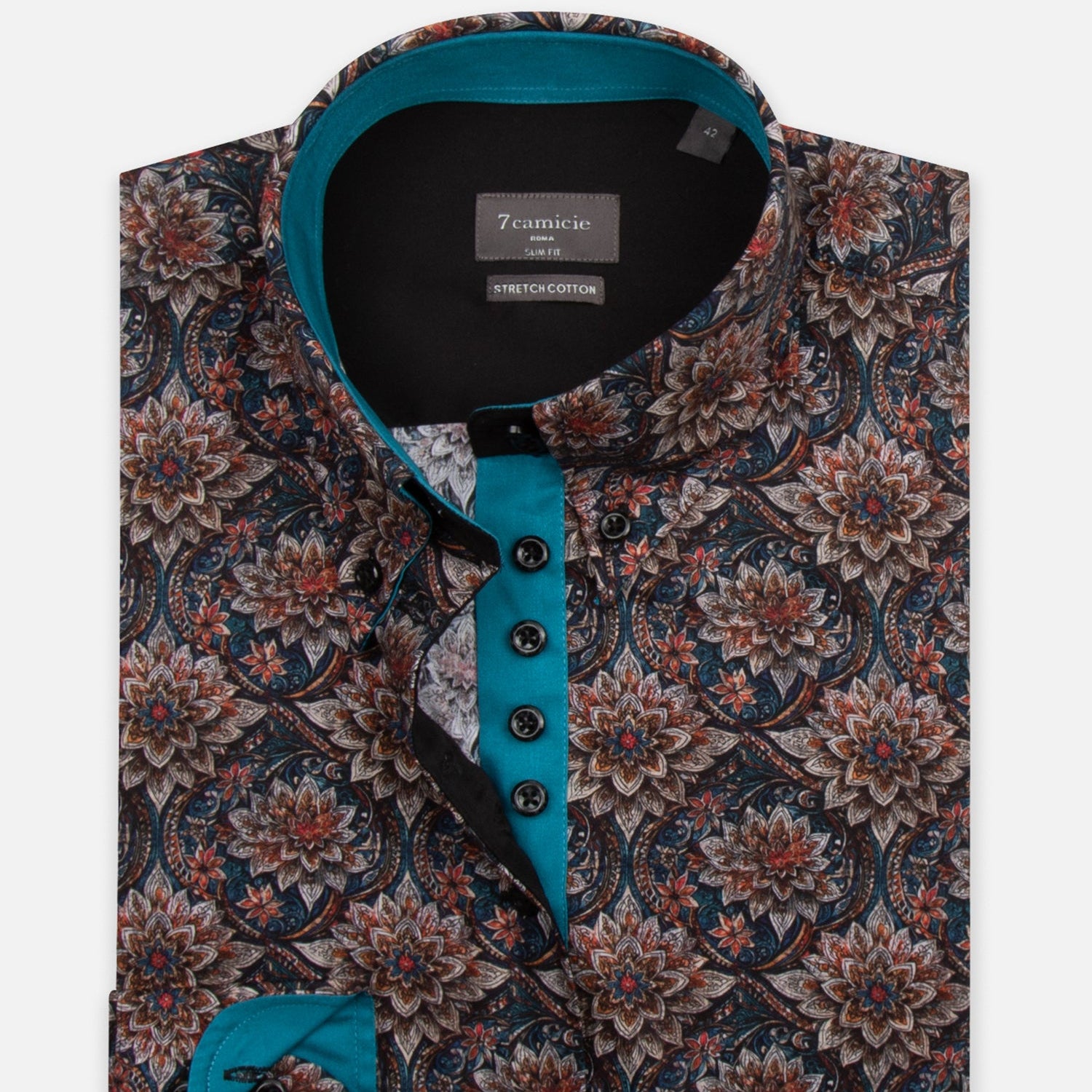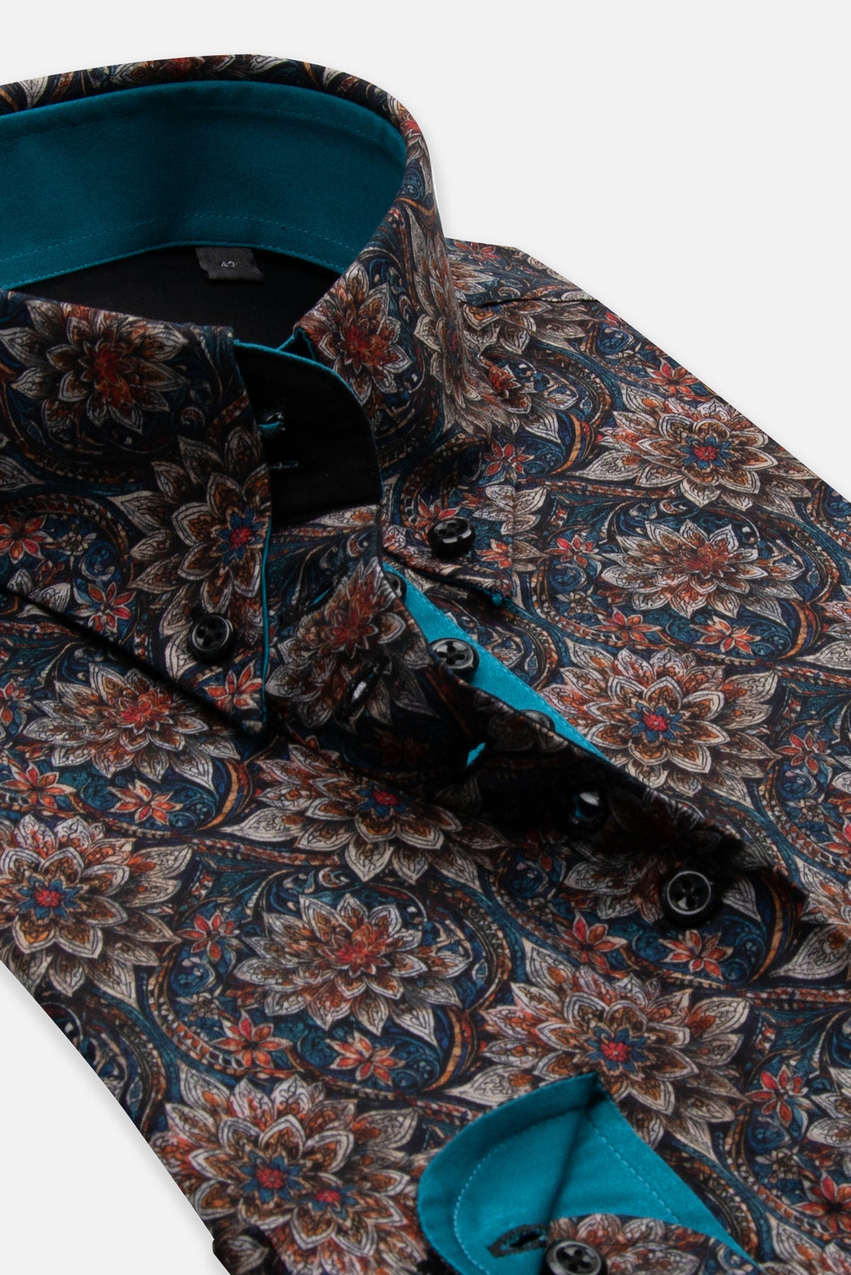 Srajco krasi bogat cvetlični vzorec v odtenkih modre, rjave, bakrene in bež barve, ki skupaj tvorijo eleganten in nekoliko orientalski motiv. Notranjost ovratnika, manšete in del sprednje obrobe so poudarjeni s kontrastno turkizno tkanino, kar doda sodoben in dinamičen pridih.